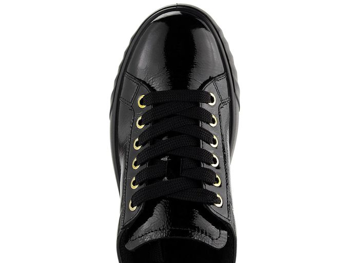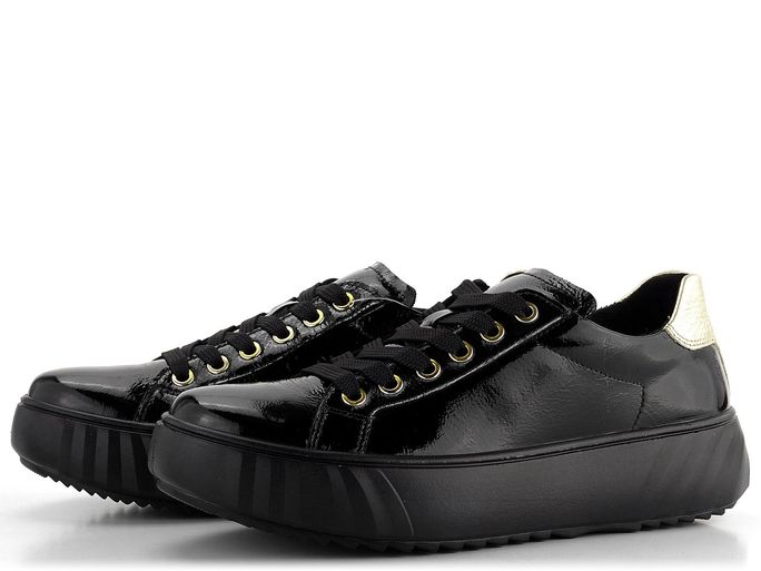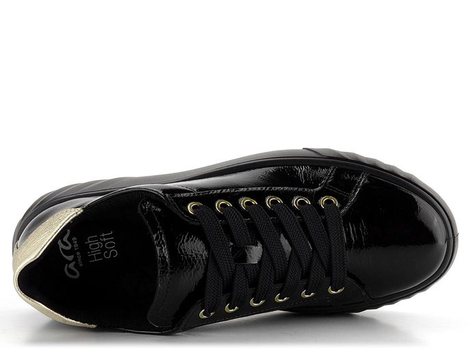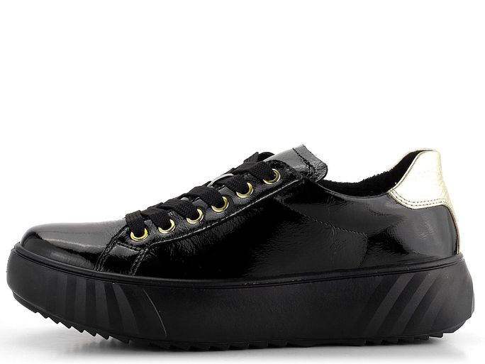 Představujeme dámské lakované polobotky značky Ara, ideální volbu pro chladnější měsíce. Tyto tenisky na platformě kombinují elegantní design s maximálním komfortem. Širší střih s kulatou špičkou je perfektní pro širší typ chodidla, což je označeno šířkou "H". Svršek z poddajné lakované kůže je zvýrazněn metalickým patním dílem a černá barva je oživena světle zlatými doplňky.