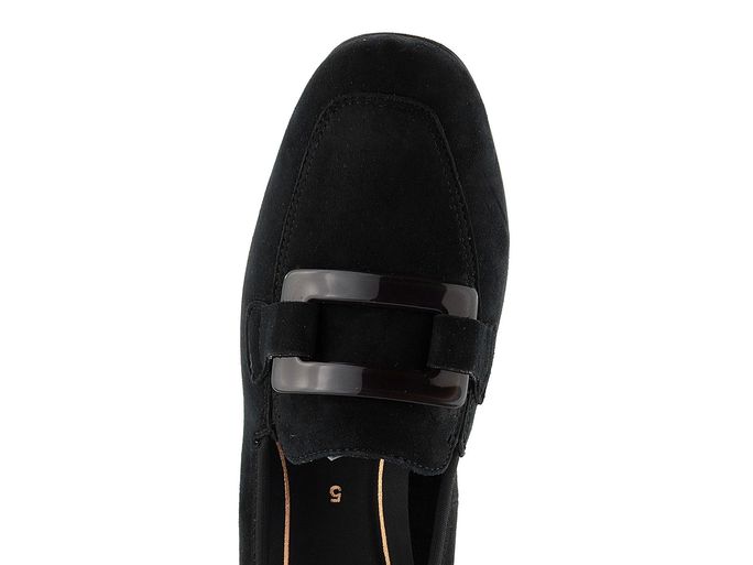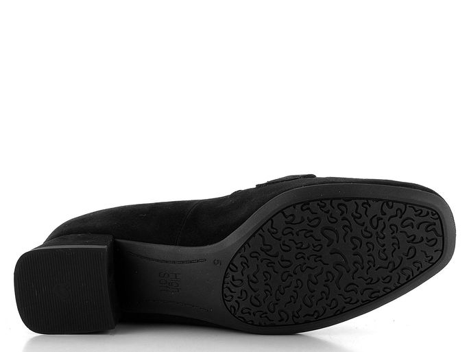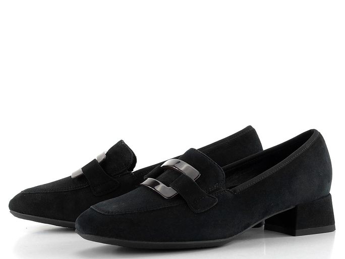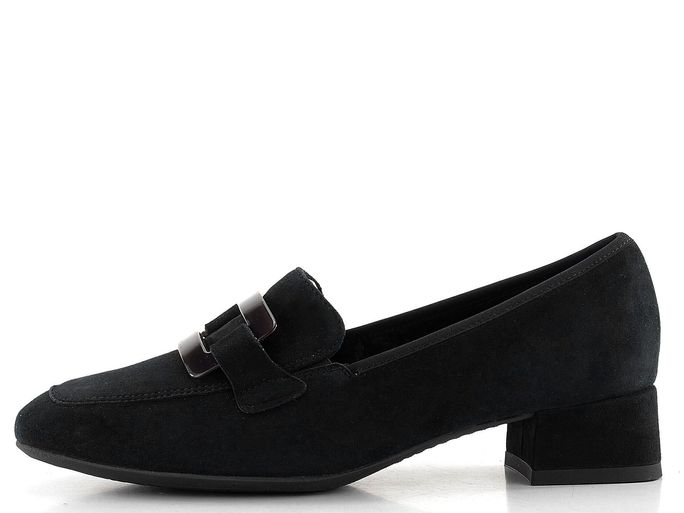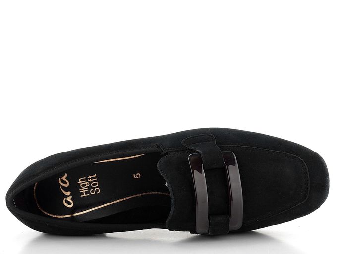 Dámské lodičky značky Ara v mokasínovém střihu a elegantní černé barvě jsou ideální volbou pro podzimní a zimní sezónu. S jejich pohodlným širším střihem "H" a hranatějším tvarem špičky se budete cítit komfortně po celý den. Vyrobené z poddajné semišové kůže, tyto lodičky mají ozdobnou plastovou sponu v šedo-hnědém transparentním provedení na nártu, což dodává na eleganci. Pro snadné obutí jsou po obou stranách nártu všité pruženky. Vnitřek bot je vybaven koženou podšívkou se zabroušeným vnitřním opatkem a extra měkkou koženou stélkou se zvýšenou podélnou klenbou. Díky inovativní technologii HighSoft® kombinující měkký svršek a polstrovanou stélku zažijete dokonalé pohodlí. Flexibilní latexová podešev a nízký, stabilní podpatek o výšce 3,5 cm zajišťují bezpečný krok. Tyto lodičky jsou vyrobeny lepeným způsobem, což přispívá k jejich trvanlivosti a kvalitě.