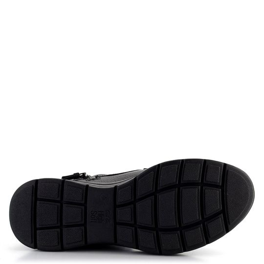 Pro snadné obutí je na vnitřní straně umístěn zip, zatímco šněrování se širokými plochými tkaničkami dodává botám stylový vzhled. Extra měkká vyjímatelná stélka s froté potahem poskytuje podporu díky vystouplému srdíčku, podélné klenbě a patní části. Pohodlná latexová podešev s mírným klínkem a výškou podpatku 4 cm zajišťuje stabilitu a pohodlí při chůzi.