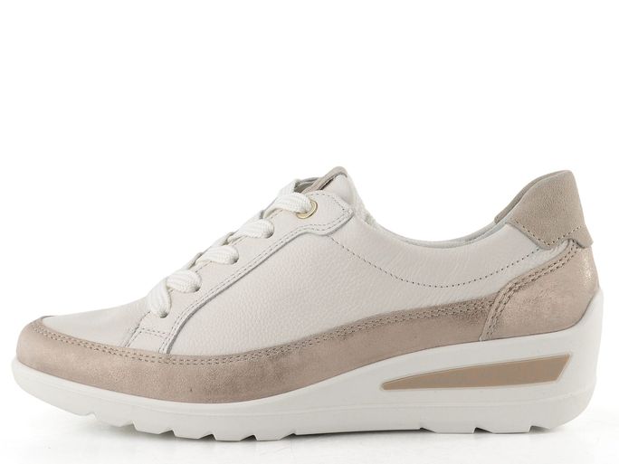 Ara širší dámské kožené polobotky na klínu jsou ideální volbou pro ženy s širším typem chodidla. Svršek z hladké a broušené kůže v elegantní smetanové a metalické béžové barvě dodává těmto botám stylový vzhled. Praktické šněrování a postranní zip usnadňují obutí, zatímco měkká vnitřní podšívka z bambusové froté textilie Ara bamboo® zajišťuje pohodlí a prodyšnost.