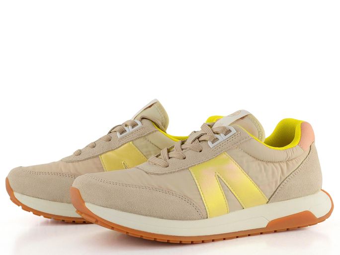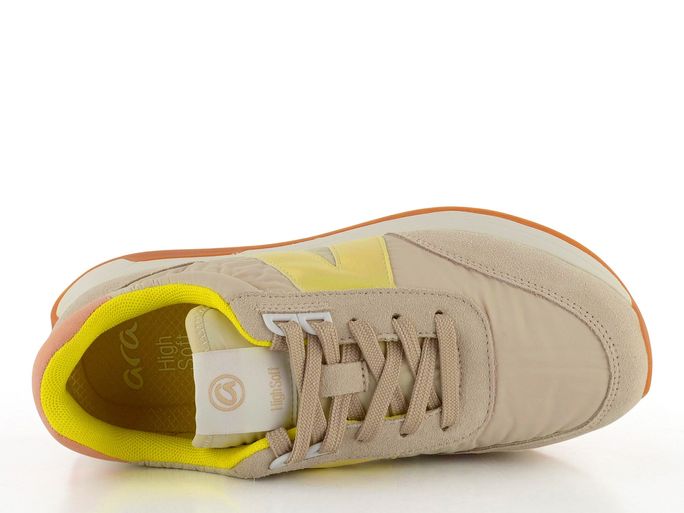 Ara širší tenisky Malibu Shell/Weiss/Limoncello/Peach od značky Ara nabízejí komfort a styl pro každou ženu. Tyto tenisky jsou navrženy s ohledem na širší chodidlo, což zajišťuje pohodlí i při celodenním nošení. Svršek z broušené a hladké textilie kombinuje elegantní béžovou, pastelově žlutou a broskvovou barvu s unikátním duhovým perleťovým leskem. Technologie HighSoft® poskytuje měkký svršek, polstrovanou stélku a flexibilní podešev, což činí z těchto bot ideální volbu pro jarní a letní měsíce. Latexová podešev a měkká vyjímatelná vložka s podporou klenby zajišťují maximální pohodlí a stabilitu.