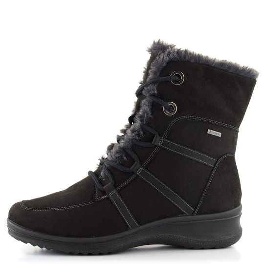 Elegantní a praktický, to je dámský kotník od značky Ara v černé barvě s jemnou tmavě šedou kožešinkou. Tento model je ideální pro podzimní a zimní měsíce díky své vodoodpudivé membráně Gore-Tex®, která zajišťuje tepelnou izolaci a ochranu proti vlhkosti. Boty jsou navrženy pro širší typ chodidla (šíře H) a nabízejí pohodlný střih s karé špičkou. Svršek je vyroben z kvalitní textílie, vnitřní část je vyteplená umělým beránkem a doplněná textilní podšívkou v oblasti nártu. Pro snadné obouvání je zde funkční zip a černá kulatá šněrovadla pro optimální dotažení. Syntetická podešev s mírným klínkem a výškou podpatku 4 cm zajišťuje stabilitu a komfort při chůzi. Výška kotníku je 14 cm, což poskytuje dostatečnou ochranu a teplo pro vaše nohy. Tento model je z kolekce 2022/23 a je skvělou volbou pro každodenní nošení ve městě i na lehké procházky venku.