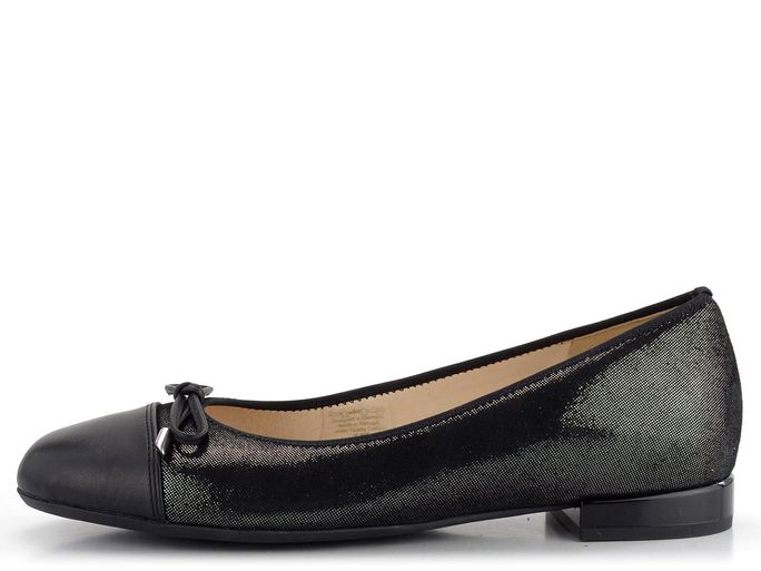 Elegantní dámské baleríny od značky Ara jsou ideální volbou pro každou ženu, která hledá pohodlí a styl v jednom. Tyto baleríny vynikají svým širším střihovým provedením "H", které zajišťuje maximální komfort i pro širší nohy. Vyrobeny z hladké a zabroušené kůže, baleríny mají černý základ s jemným metalickým potiskem ve stříbrné barvě, což jim dodává sofistikovaný vzhled.