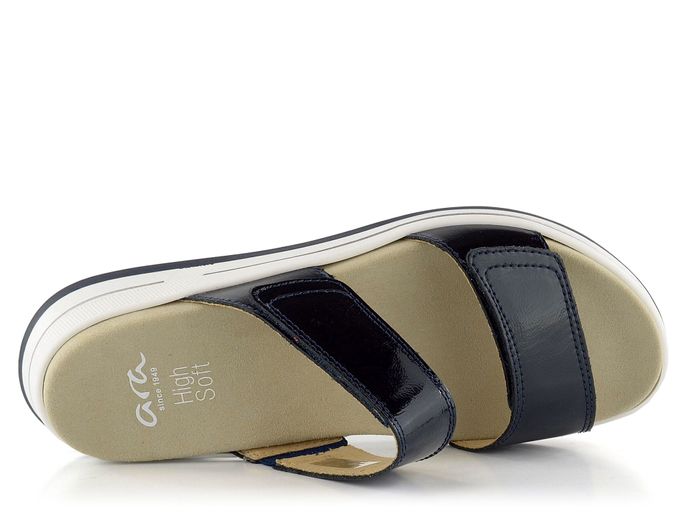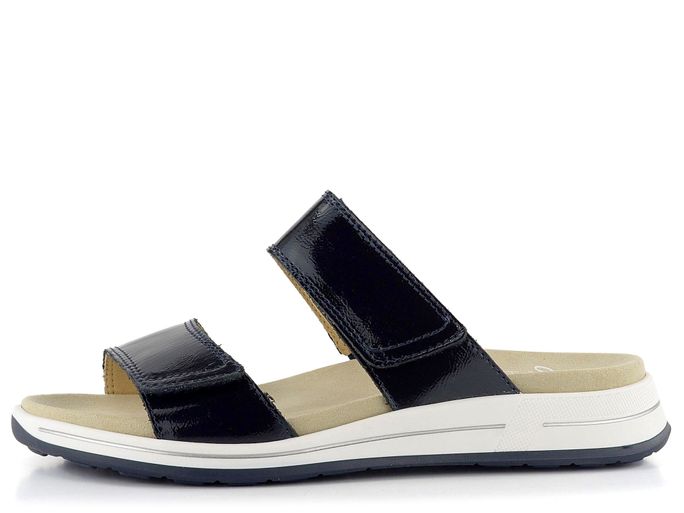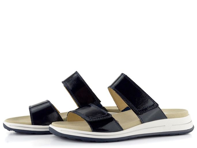 Dámské širší pantofle z lakované kůže, s upínacími pásky na suchý zip a s měkkou, vyjímatelnou stélkou.