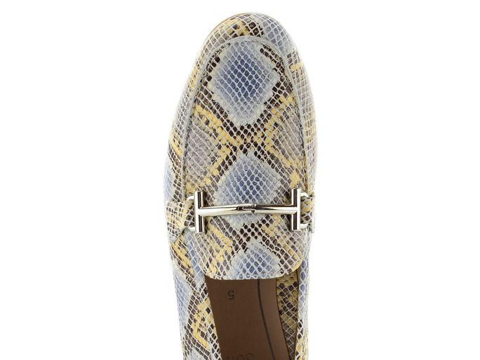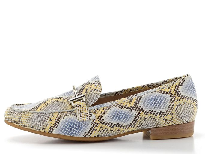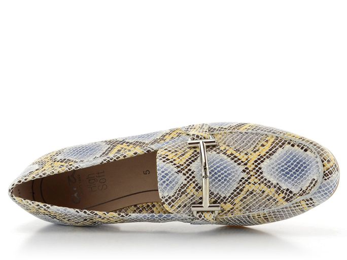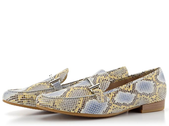 Dámské elegantní mokasíny s barevnou hadinkou a širokým podpatkem.