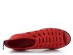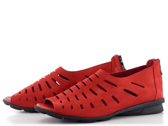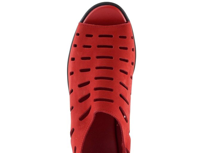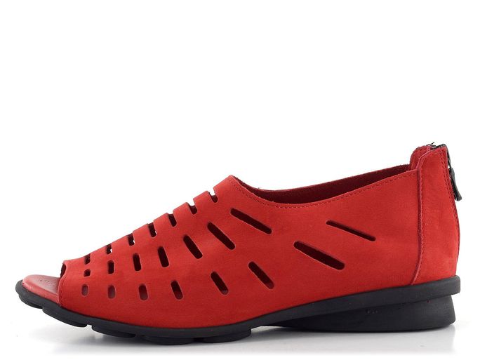 Dámské sandálky z nubukové kůže s otevřeným palcem a patním zipem, v syté červené barvě.