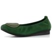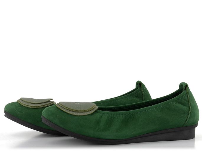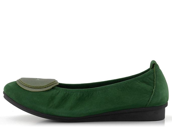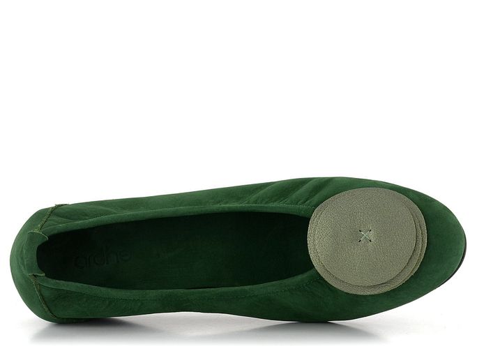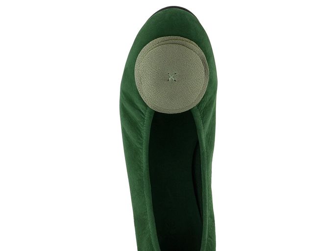 Luxusní dámské balerínky z nubukové kůže v tmavě zelené barvě, se zajímavou ozdobou na špičce.