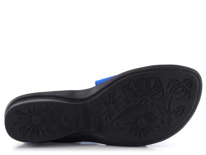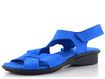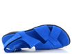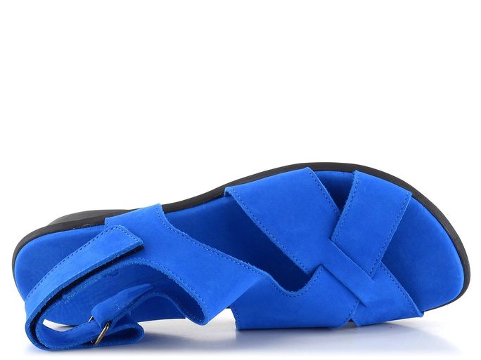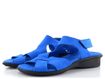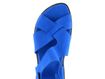 Dámské kožené sandálky v zářivě modré barvě s upínáním na suchý zip a nízkým klínkem.