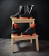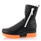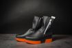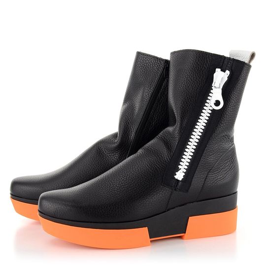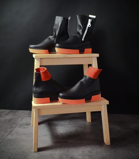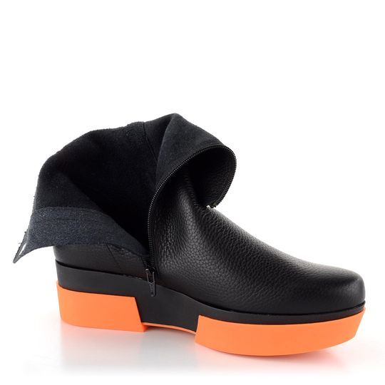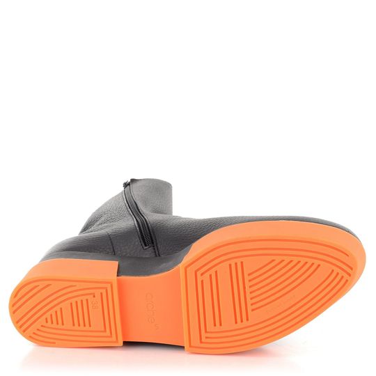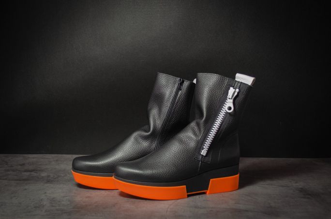 Kotník s neonově oranžovou podešví a svrškem z pevného plátu kůže.
