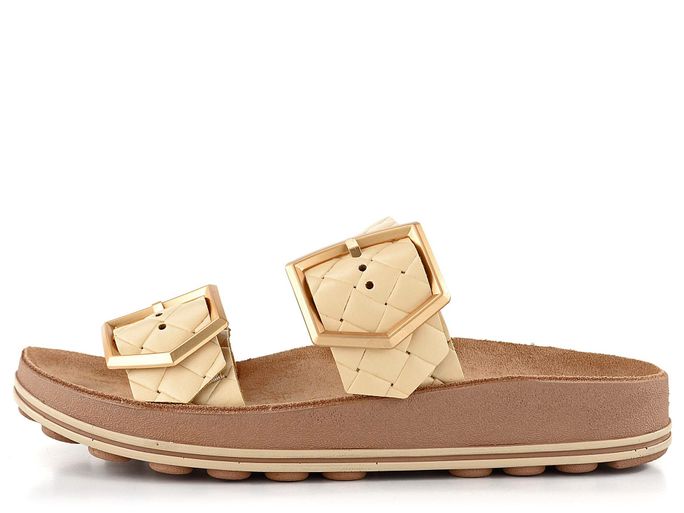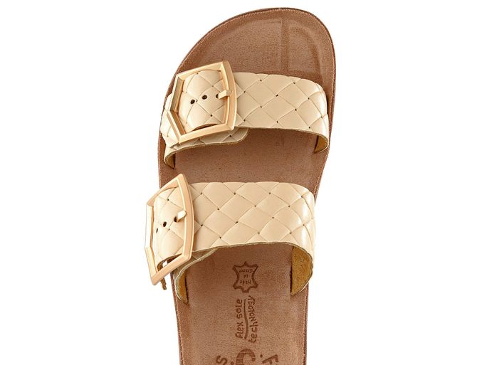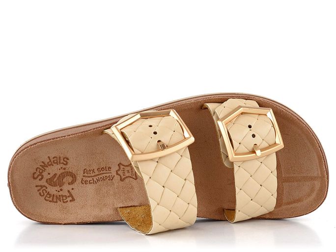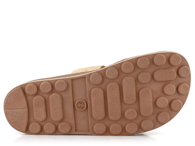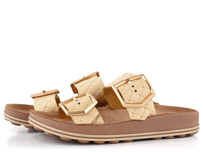 Komfortní dámské pantofle v celokoženém provedení a světlé béžové barvě.