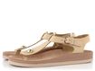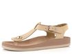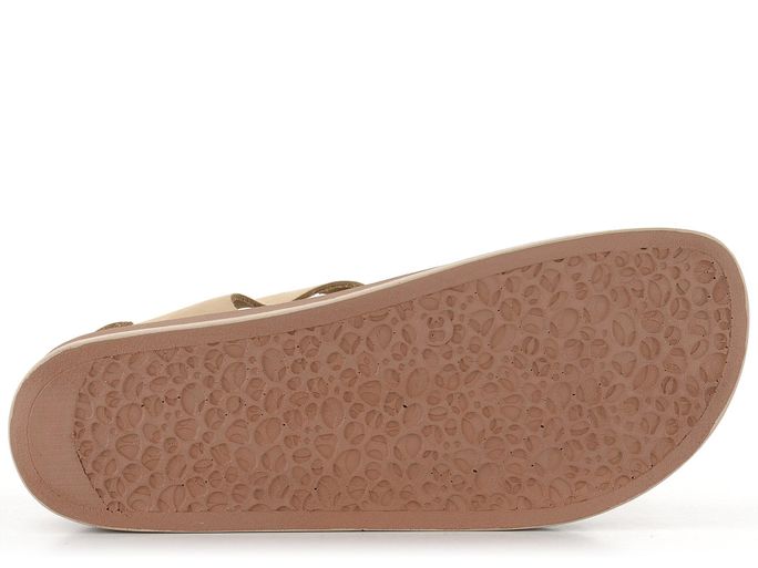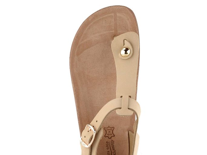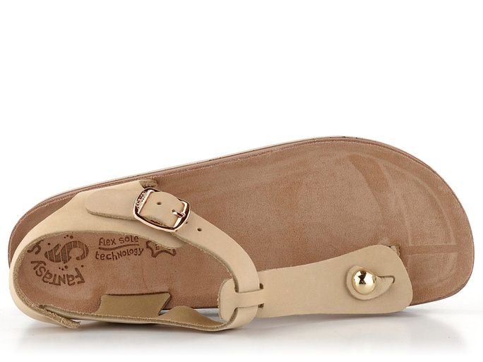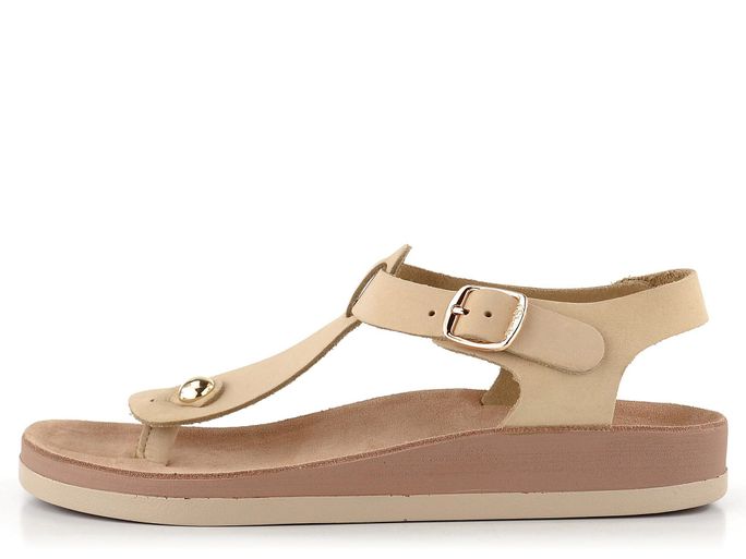 Celokožené sandály ve světlé béžové barvě, s plochým páskem mezi prsty a flexibilní podešví.