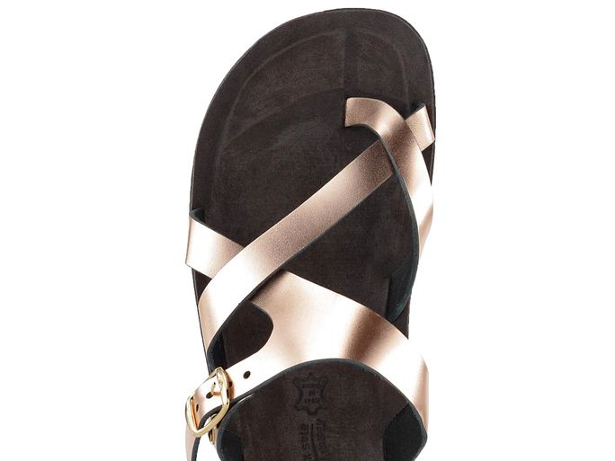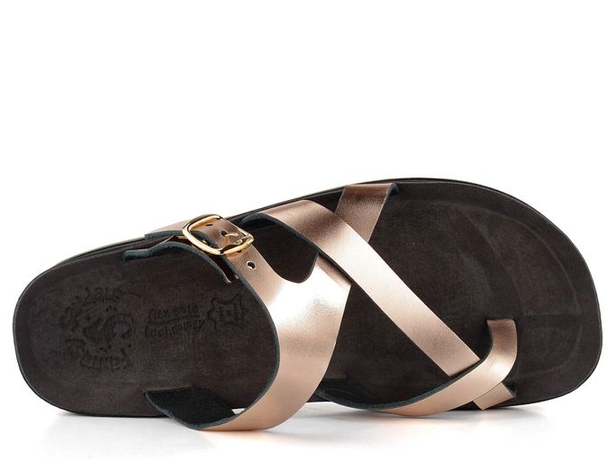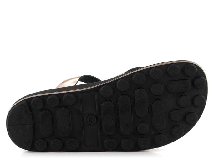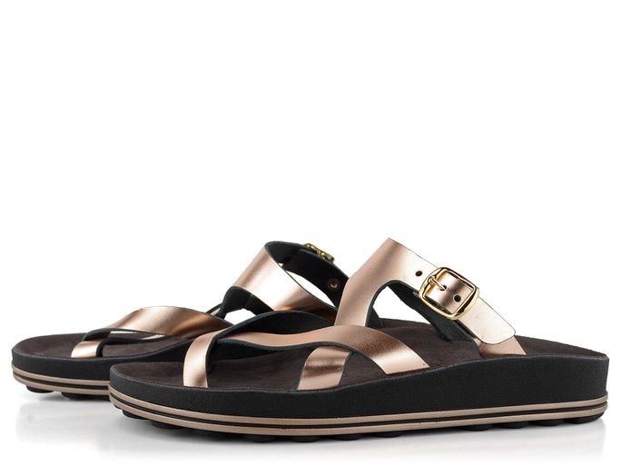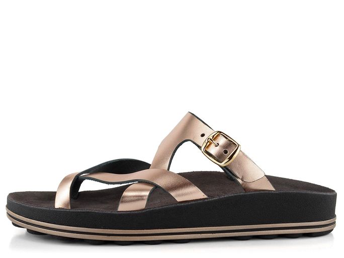 Dámské kožené pantofle/žabky s metalickými pásky a komfortní, tvarovanou stélkou.
