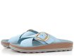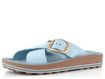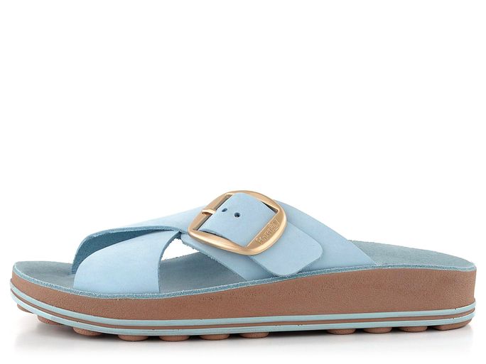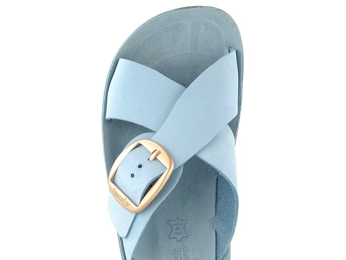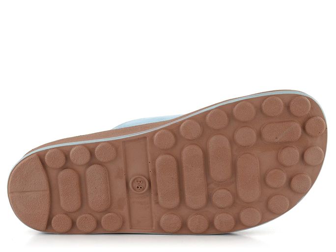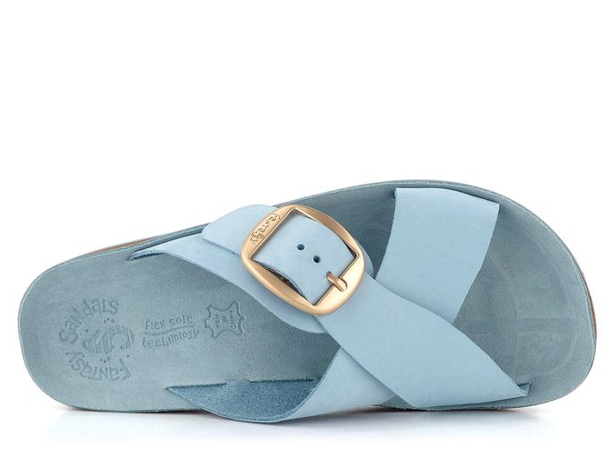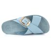 Komfortní dámské pantofle v celokoženém provedení, s kříženými pásky v blankytně modré barvě.