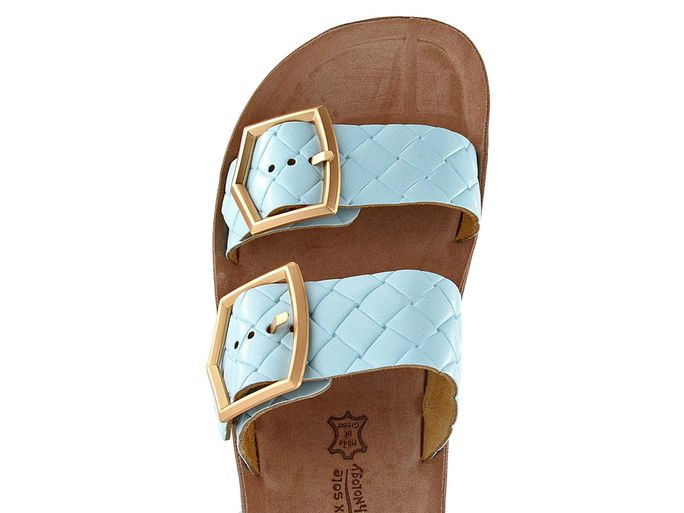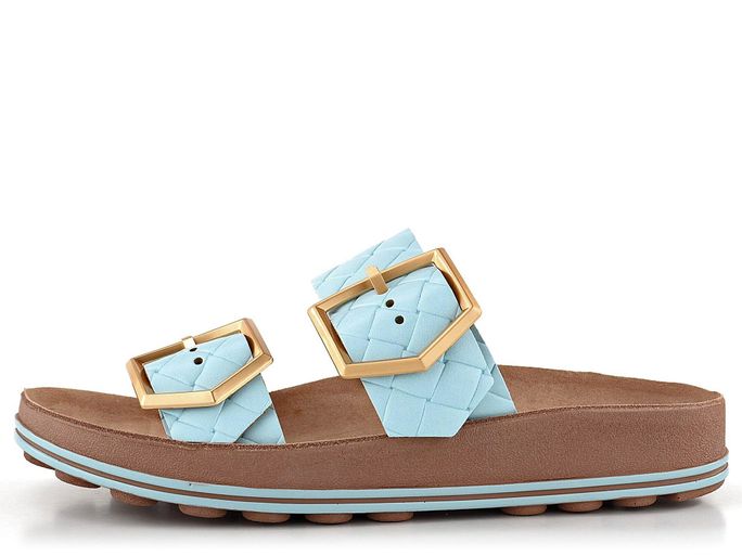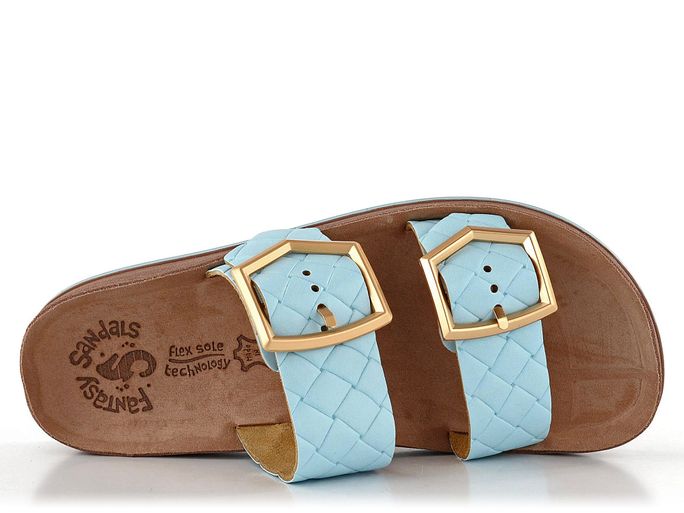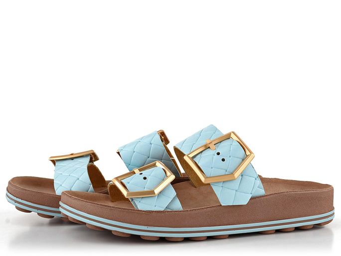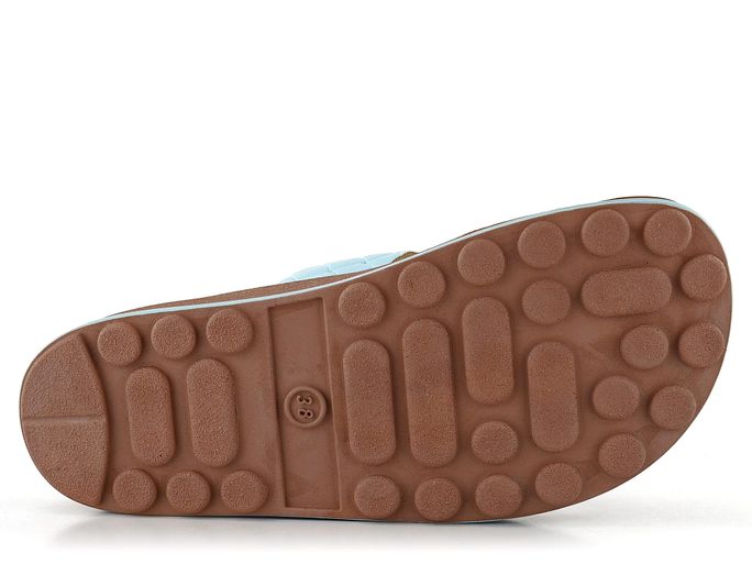 Komfortní dámské pantofle v celokoženém provedení a blankytně modré barvě.