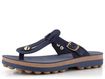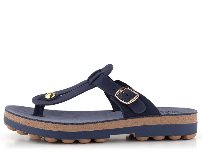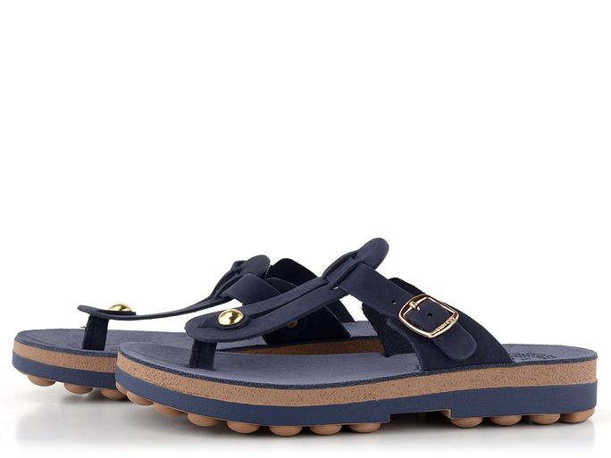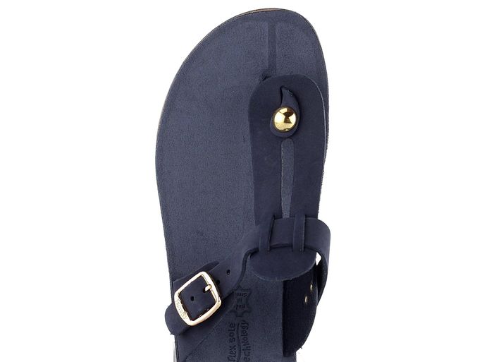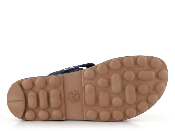 Celokožené žabky v tmavě modré barvě, s plochým páskem mezi prsty a flexibilní podešví.