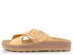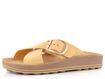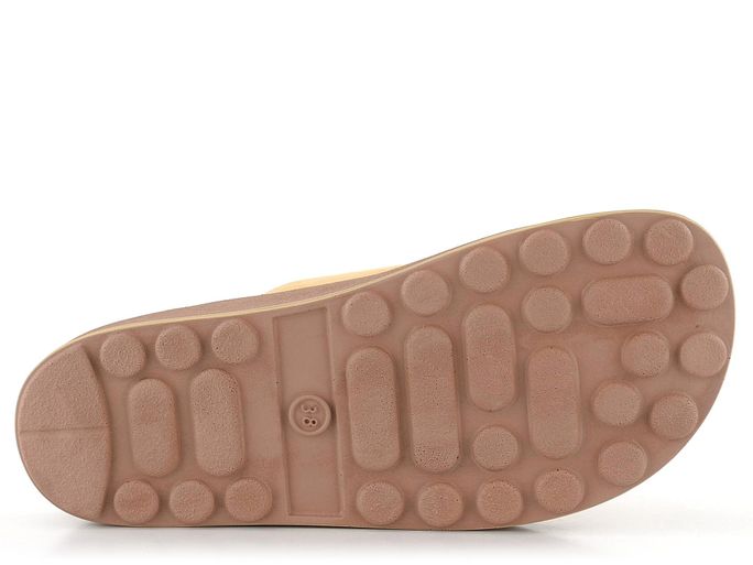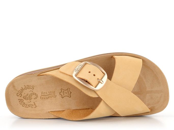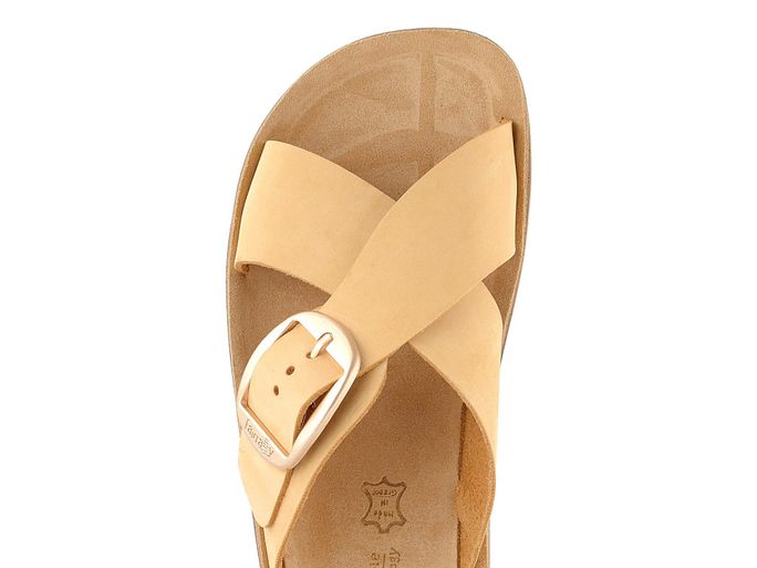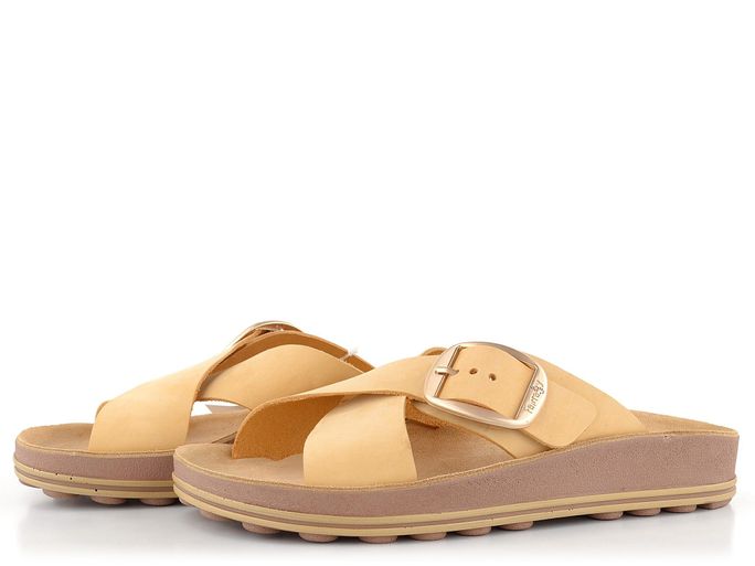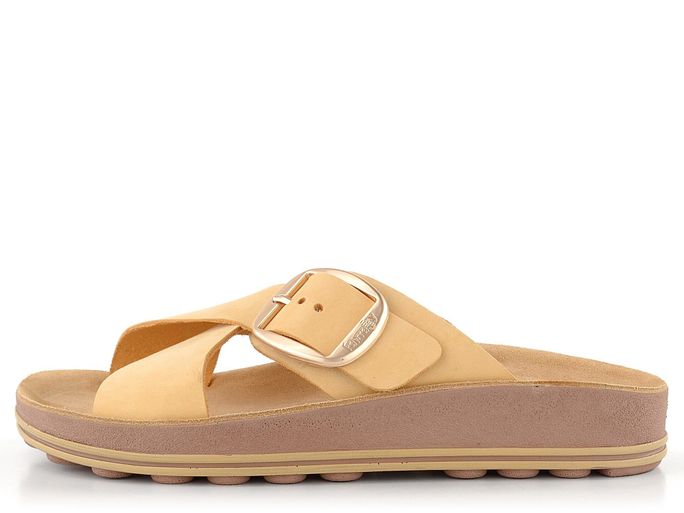 Komfortní dámské pantofle v celokoženém provedení, s kříženými pásky v pastelově žluté barvě.