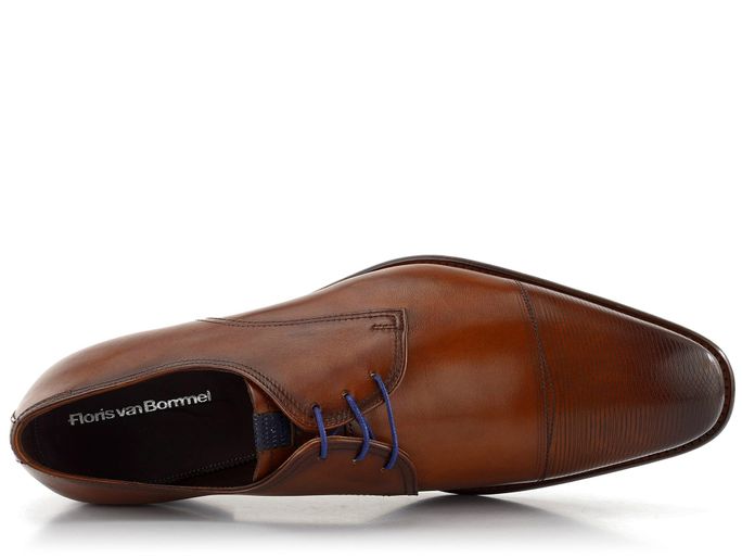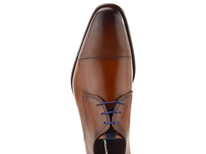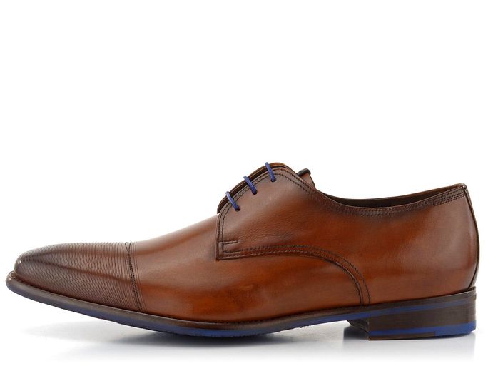 Luxusní pánské šněrovací polobotky v koňakově hnědé barvě se zdobenou špičkou a s unikátními modrými doplňky.