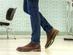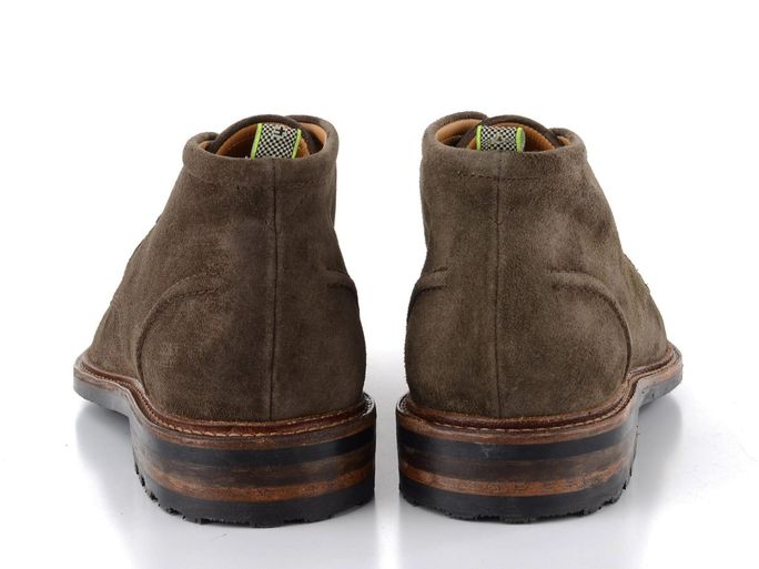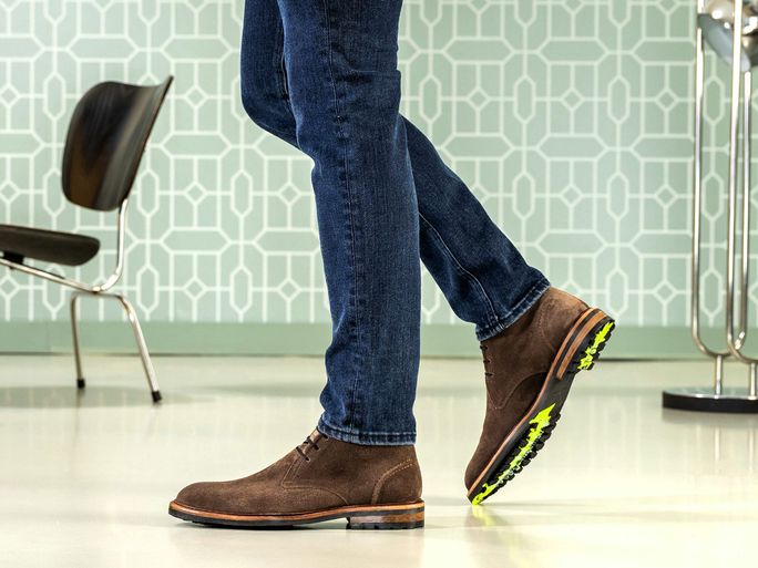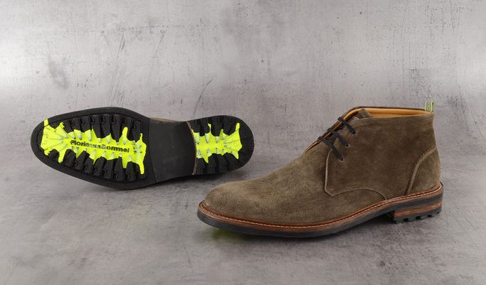 Originální pánský ležérní kotník ze semišové kůže s nevšední vrstvenou podešví a fluoresenčním nástřikem.