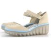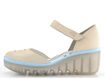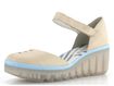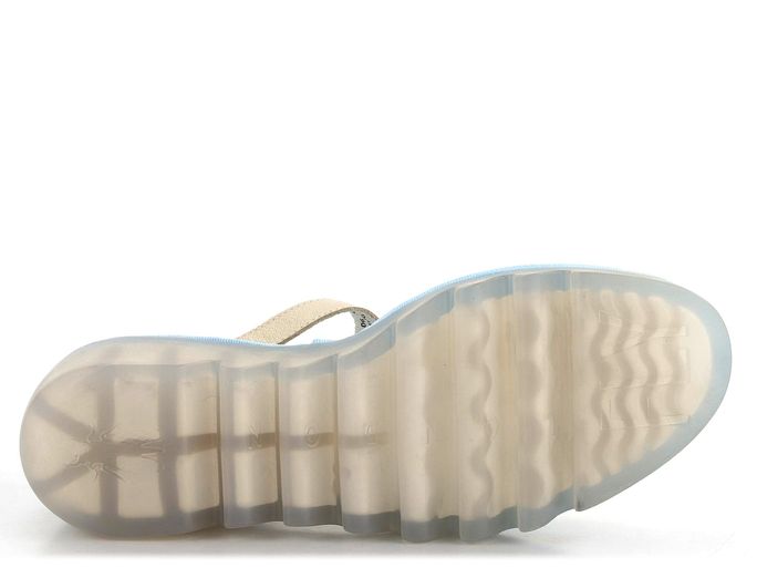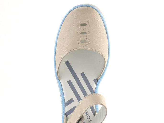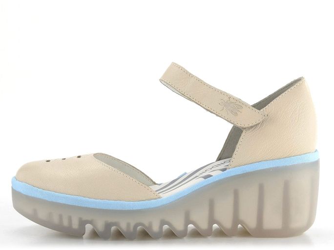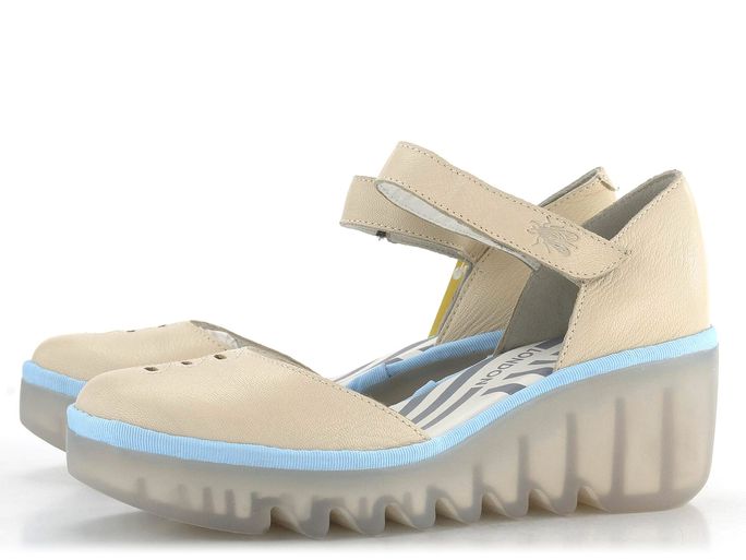Dámské kožené lodičky na klínu od značky Fly London vynikají svým komfortním střihem s kulatou špičkou a jemným světlým béžovým odstínem. Svršek je vyroben z jemně strukturované kůže, což zaručuje nejen estetický vzhled, ale i dlouhou životnost. Stylový detail v podobě obšívané podešve světle modrou rypsovou stuhou dodává botám jedinečný charakter. Pásek kolem nohy je upínán na suchý zip, což zajišťuje snadné obouvání a pohodlné nošení. Uvnitř najdete poddajnou koženou podšívku a měkkou stélku s hladkým koženým potahem, která poskytuje maximální pohodlí. Vyšší latexová platforma s klínem a vlnkovitým profilem dodává botám nejen elegantní vzhled, ale i stabilitu. Tyto lodičky jsou ideální volbou pro jarní a letní sezónu, ať už do města, kanceláře nebo na lehkou procházku.