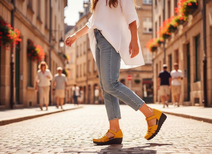 Dámské kožené sandály na klínu od značky Fly London představují ideální volbu pro jarní a letní dny. Jejich hořčicově žlutý odstín přináší do vašeho outfitu svěží a stylový prvek. Komfortní střih s kulatou špičkou a páskem na suchý zip zajišťuje snadné obouvání a dokonalé přizpůsobení noze. Svršek z hladké kůže a měkká stélka potažená syntetikou poskytují příjemný pocit během celodenního nošení. Vysoká latexová platforma s hrubým vlnkovitým profilem nejenom že dodává na výšce, ale také zajišťuje stabilitu. Tyto sandály jsou ideální pro městské procházky i formální příležitosti.
