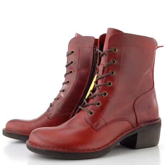 Šněrovací kotníkové boty v výrazné červené barvě od značky Fly London jsou ideální volbou pro podzimní a zimní dny. Tyto boty kombinují kulatý tvar špičky s pevnější kůží a jemným stínováním, které dodává na atraktivitě. Pro snadné obutí je k dispozici postranní zip, zatímco vzorovaná textilní podšívka zajišťuje pohodlí.