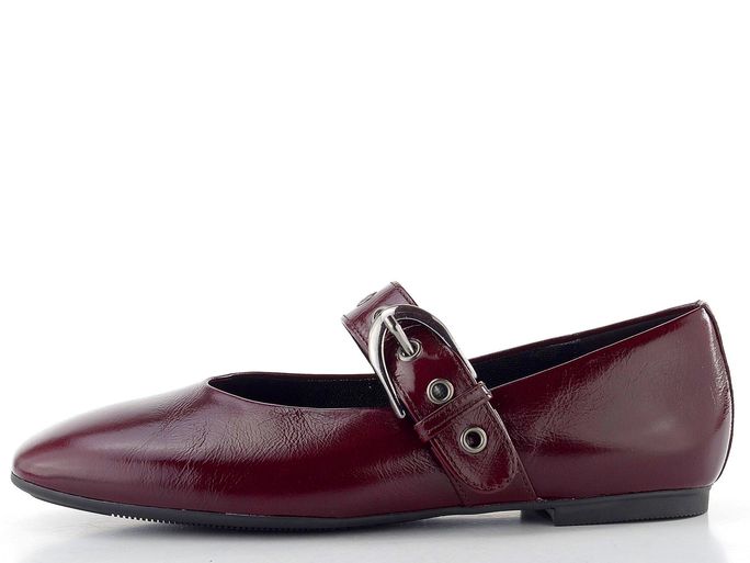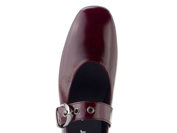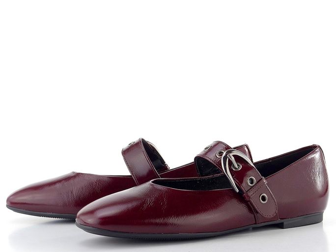 Dámské módní baleríny z vínové lakované kůže s nártovým páskem a nízkým podpatečkem.