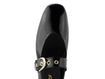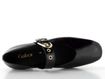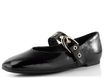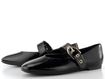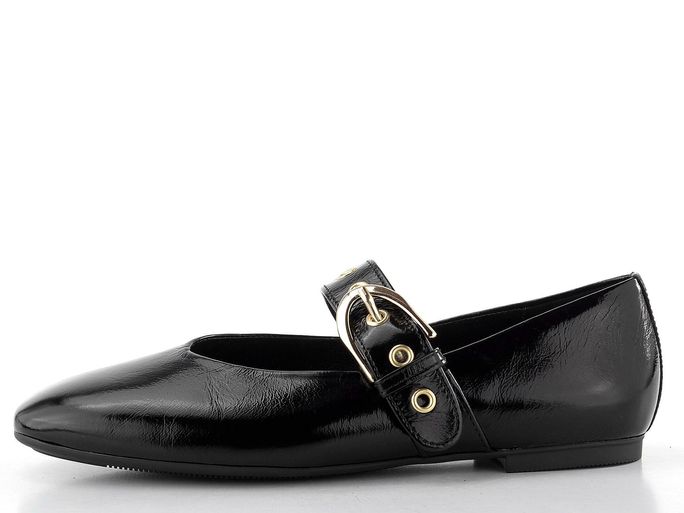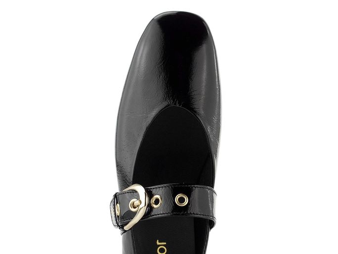 Dámské módní baleríny z černé lakované kůže s nártovým páskem a nízkým podpatečkem.
