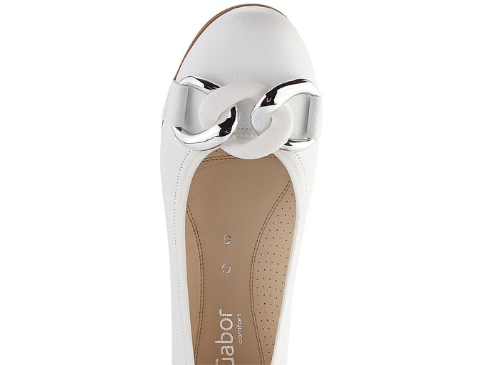 Komfortní a precizně zpracované baleríny zdobené řetízkem od značky Gabor jsou ideální volbou pro ženy, které hledají styl a pohodlí. Tyto baleríny vynikají jemně strukturovaným koženým svrškem v elegantní bílé barvě a nápadným řetízkem na špičce, který kombinuje matný plast a lesklý kov v bílo-stříbrné kombinaci. Díky lemu opatřenému paspulkou obuv lépe přilne k tvaru chodidla, zatímco kožená stélka s perforací a latexová podešev se vzduchovými komorami Air Cube zajišťují měkký krok. Podšívka z netkané textilie a vyztužený kožený opatek přidávají na komfortu. S výškou podpatku 2 cm jsou tyto baleríny skvělou volbou pro jarní a letní sezónu.