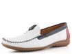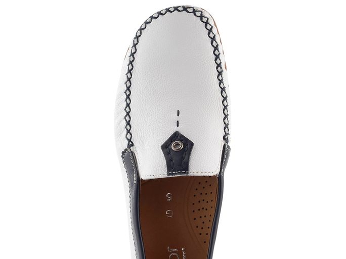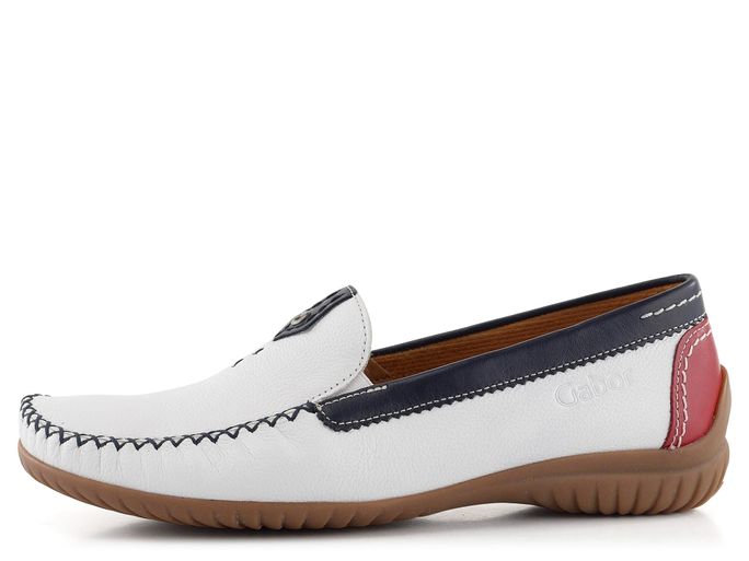 Luxusní dámské mokasíny od značky Gabor vynikají svou elegancí a komfortem. Díky prostornému střihu s hranatější špičkou poskytují maximální pohodlí po celý den. Svršek z pevné strukturované kůže v bílé barvě je doplněn stylovými detaily v tmavě modré a červené barvě.