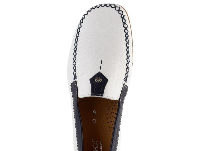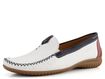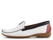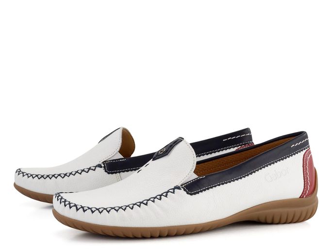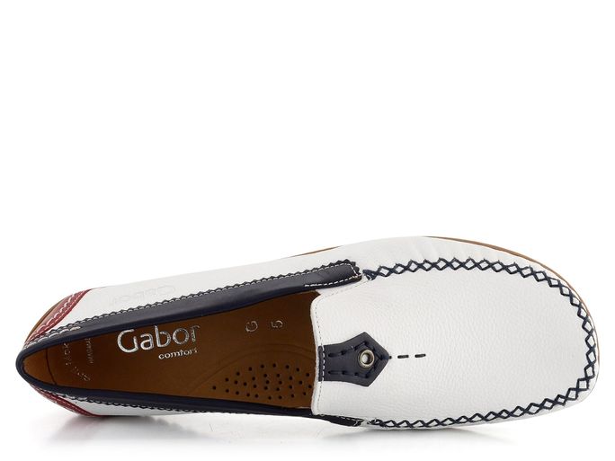 Luxusní dámské mokasíny od značky Gabor vynikají svým extra komfortním střihem a kvalitním zpracováním. Tento model je ideální volbou pro jarní a letní sezónu. Mokasíny mají prostorný střih s hranatější špičkou, což zaručuje pohodlí po celý den. Svrchní materiál tvoří pevná strukturovaná kůže v bílé barvě, doplněná o tmavě modré a červené detaily, které dodávají botám stylový vzhled.