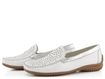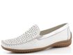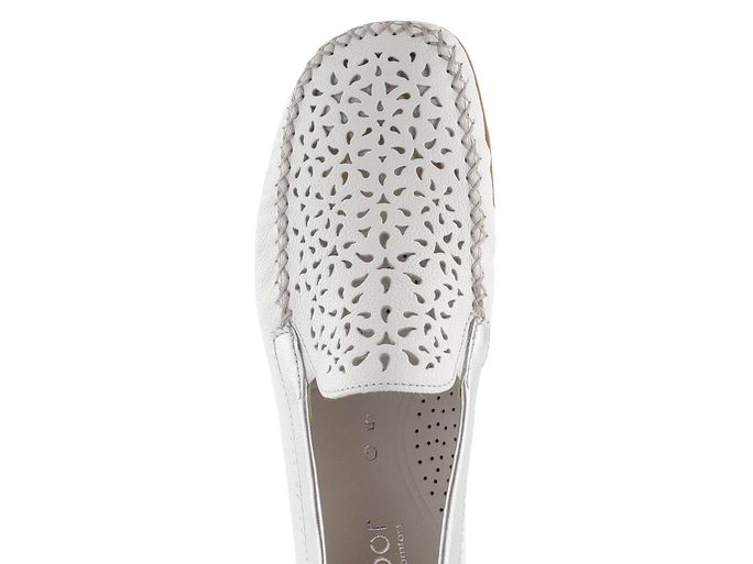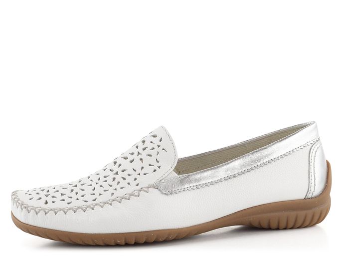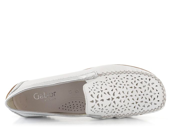 Luxusní dámské mokasíny od značky Gabor jsou ideální volbou pro moderní ženu, která hledá pohodlí a styl. Tento model vyniká extra komfortním střihem a pevnou strukturovanou kůží, která zajišťuje dlouhou životnost. Mokasíny jsou v elegantní bílé barvě s ozdobně prořezávanou špičkou, která nejen dobře vypadá, ale také příjemně odvětrává chodidlo. Lem obuvi a patní díl jsou vyrobeny ze stříbrné metalické kůže, což dodává botám luxusní vzhled. Díky pružným gumičkám na nártu se snadno přizpůsobí každému chodidlu. Mokasíny mají extra měkkou koženou stélku se zvýšenou podélnou klenbou a flexibilní latexovou podešev, která zaručuje pohodlí při každém kroku. Tento model je vyroben lepeným výrobním způsobem, což zajišťuje jeho vysokou kvalitu a odolnost. S výškou podpatku 2,7 cm jsou tyto mokasíny skvělou volbou pro každodenní nošení i formální příležitosti.