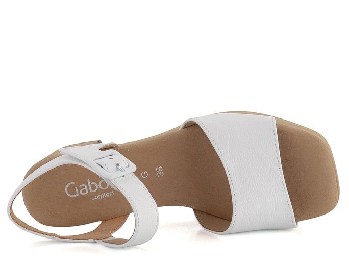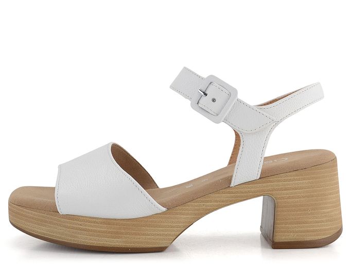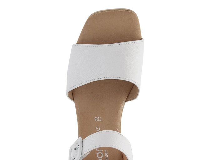 Tyto luxusní dámské sandály na platformě od značky Gabor jsou ideální volbou pro jarní a letní sezónu. Svršek je vyroben ze strukturované kůže v elegantní bílé barvě, která dodává obuvi sofistikovaný vzhled. Sandály mají kotníkový pásek s pruženkou a zapínáním na suchý zip, což zajišťuje snadné obouvání a pohodlné nošení.