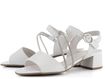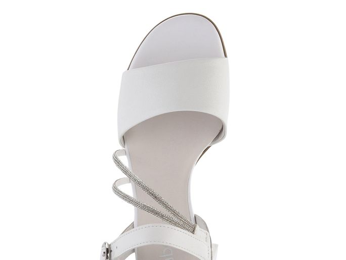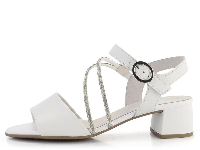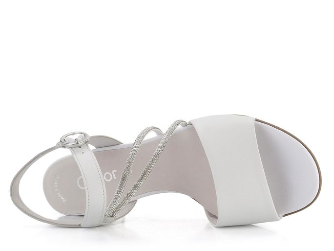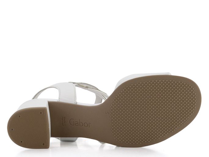 Decentní dámské sandály od značky Gabor představují dokonalou kombinaci elegance a pohodlí. Svršek z hladké kůže a syntetiky v lehce odražené bílé barvě je doplněn krásně třpytivými, šikmo střiženými pásečky posetými blyštivými kamínky. Pásky jsou z vnitřní strany opatřeny pružinkami pro dokonalé padnutí, zatímco sponka na vnější straně umožňuje regulaci délky pásku kolem nohy. Sandály mají příjemně měkkou koženou stélku a pohodlný potažený podpatek vysoký 4,5 cm, což zajišťuje komfort i při delším nošení. Podešev s hrubším vzorkem poskytuje bezpečnou chůzi. Tento model je ideální volbou pro jarní a letní sezónu, kdy chcete spojit styl s pohodlím.