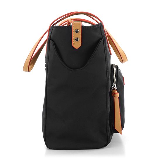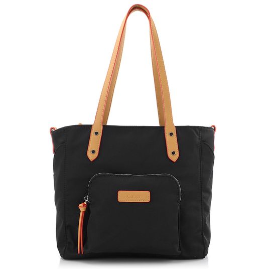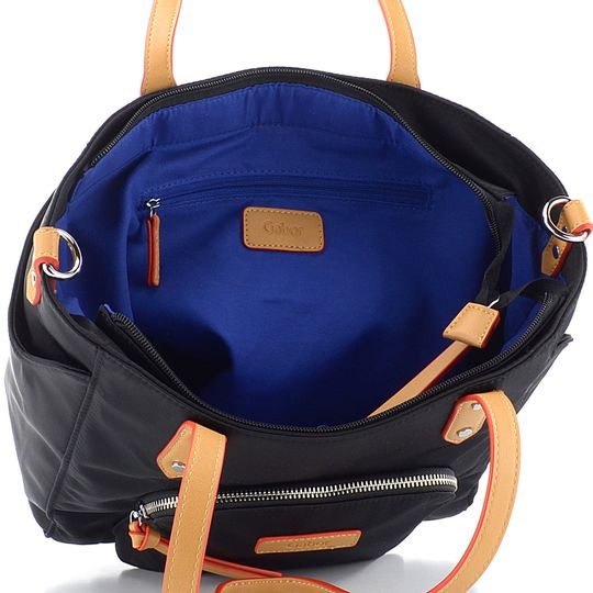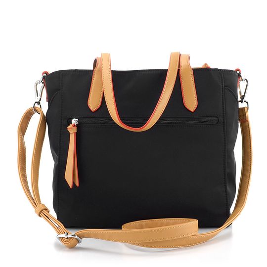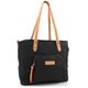 Dámská shopper kabelka z pevného, textilního materiálu a s kontrastními doplňky.