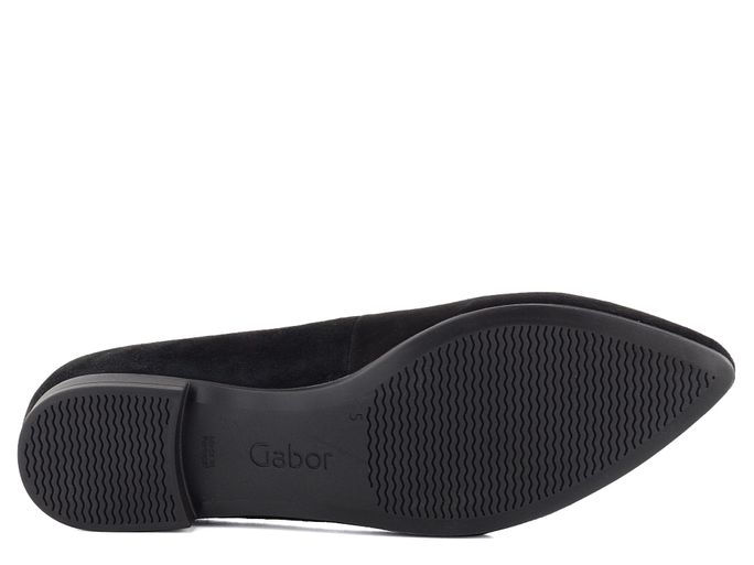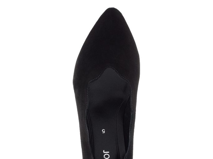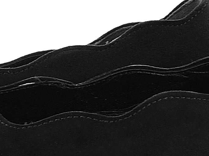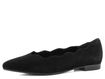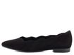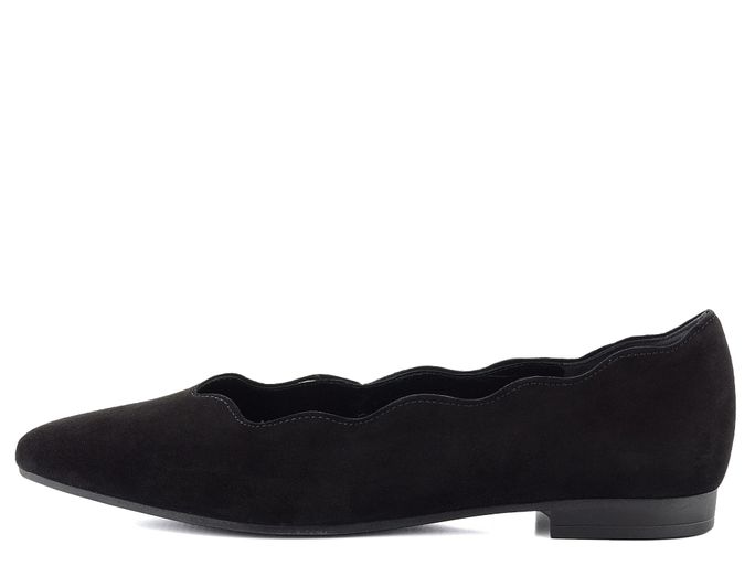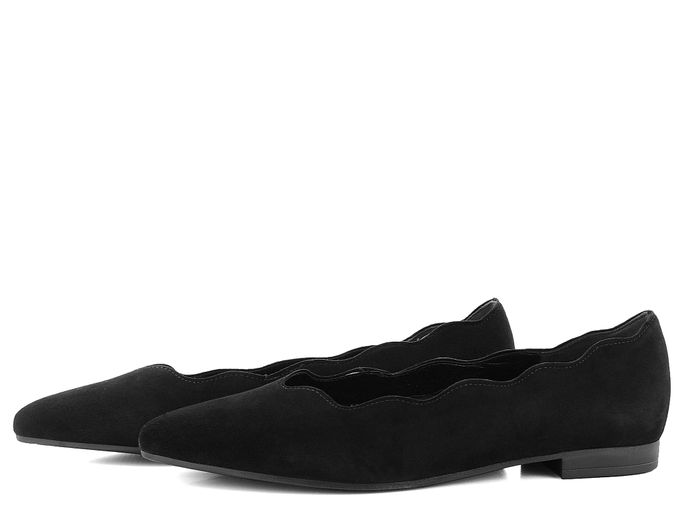 Dámské baleríny ze semišové černé kůže s elegantním vlnkovaným lemem, měkčenou stélkou a nízkým podpatkem.