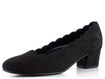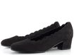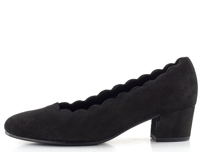 Dámské lodičky z černé broušené kůže s ozdobným vlnkovitým lemem, pohodlným širokým podpatkem a speciální odolnou podešví.