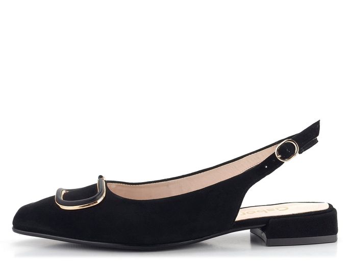 Elegantní a stylové, tyto dámské semišové baleríny od značky Gabor jsou ideální volbou pro jarní a letní sezónu. Vynikají svým elegantním střihem do špičky a prvotřídní semišovou kůží v nadčasové černé barvě. Ozdobná spona na špičce v černo-zlaté kombinaci dodává botám luxusní vzhled.