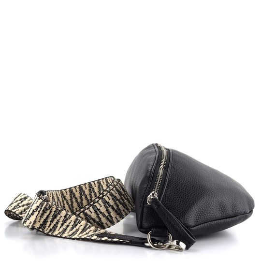 Tato dámská crossbody kabelka/ledvinka od značky Gabor je ideálním doplňkem pro moderní ženu. Její oblý ledvinkový tvar a menší střih jsou perfektní pro vaše nezbytnosti. Vyrobena z poddajné strukturované syntetiky v elegantní černé barvě s kováním ve stříbrné barvě, tato kabelka dodá vašemu outfitu sofistikovaný nádech. Praktická zipová kapsička na zadní straně je ideální pro rychlý přístup k drobnostem. Hlavní kapsa na zip obsahuje jednu zipovou přihrádku a jednu přihrádku na mobil či klíče. Kabelka disponuje dvěma odepínatelnými ramenními popruhy – elegantním slabším (82-148 cm) a sportovním širším s vytkávaným modro-bílým vzorem (92-144 cm). Rozměry kabelky: horní šířka 27 cm, výška 17 cm. Tato kabelka je skvělým spojením stylu a praktičnosti a je součástí kolekce Jaro/Léto 2024.