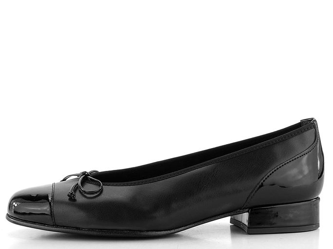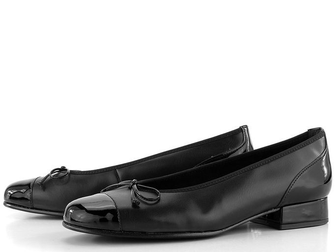 Komfortní dámské baleríny od značky Gabor jsou ideální volbou pro podzimní a zimní sezónu. Tyto elegantní boty v černé barvě kombinují hladkou a lakovanou syntetiku, což jim dodává sofistikovaný vzhled. Kulatá špička je zdobena ozdobnou mašličkou, která přidává na ženskosti. Uvnitř naleznete podšívku z broušené textilie a měkčenou stélku potaženou hladkou kůží, což zajišťuje maximální pohodlí při každém kroku. Nízký a stabilní podpatek o výšce 2,5 cm v lakovaném provedení dodává balerínám eleganci, zatímco flexibilní syntetická podešev s jemným vzorkem poskytuje bezpečný krok. Kožený vnitřní opatek drží chodidlo pevně na svém místě. Tyto baleríny jsou ideální volbou pro každodenní nošení do kanceláře či na lehkou procházku městem.