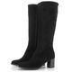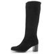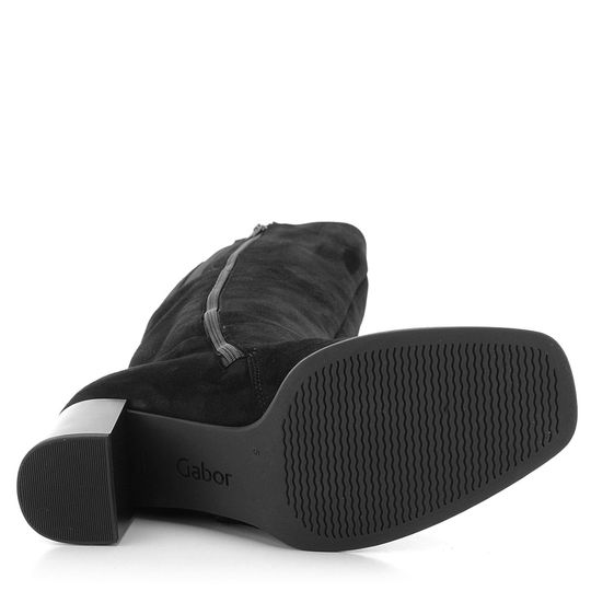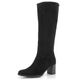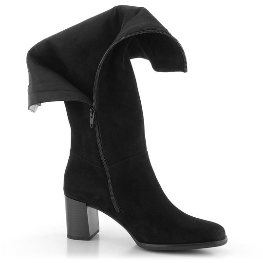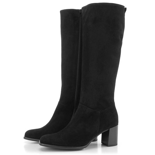 Elegantní dámské kozačky velikosti M z černé semišové kůže a se stabilním středně vysokým podpatkem.