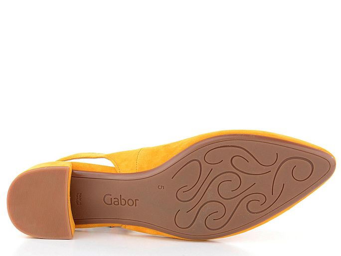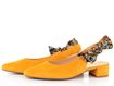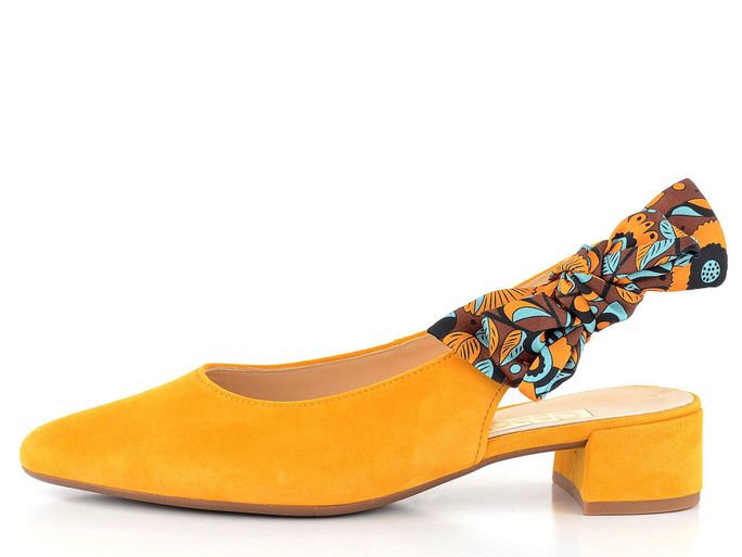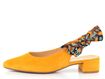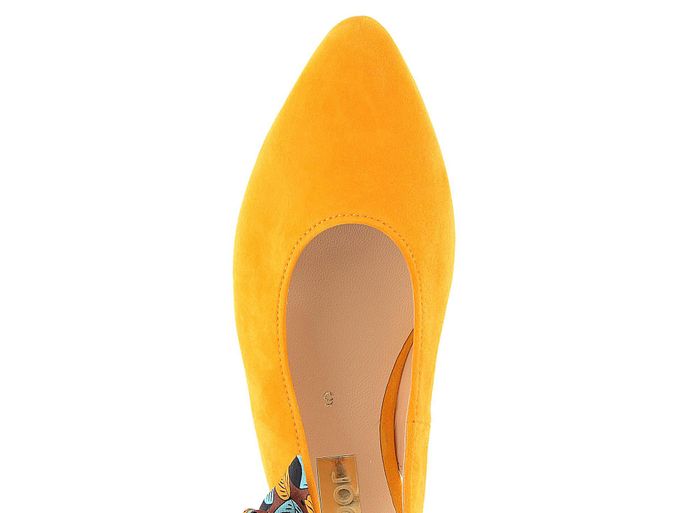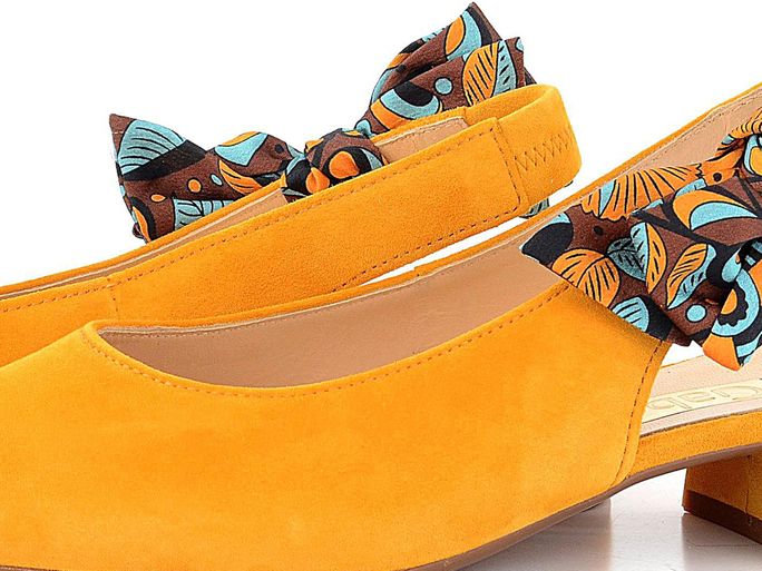 Sytě žluté lodičky ze semišové kůže, s volnou patou a krásně doladěnou mašličkou na boku.