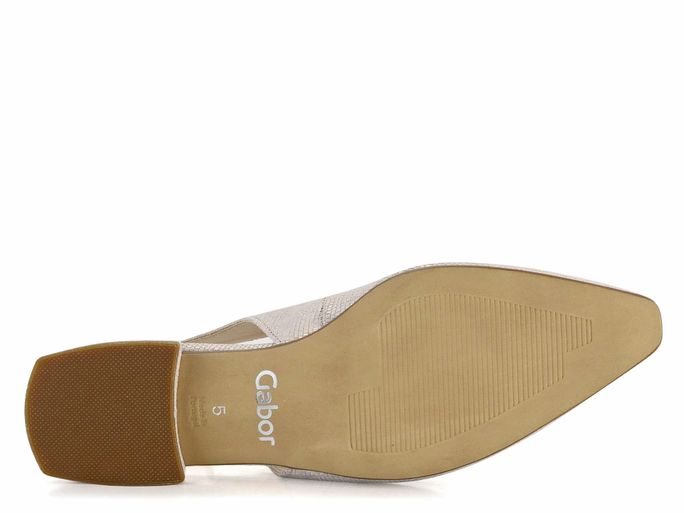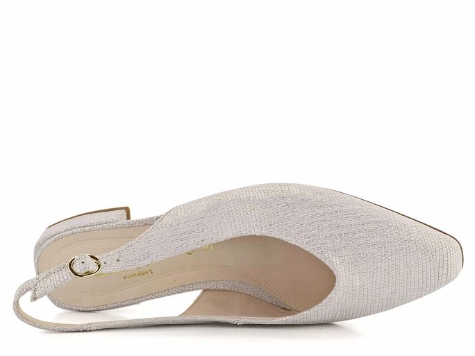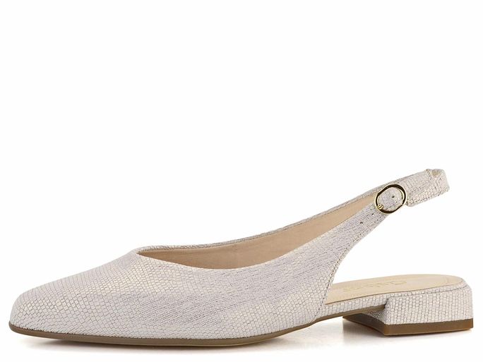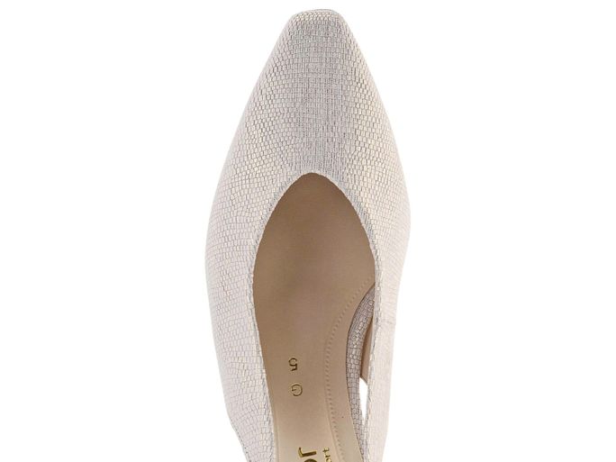 Luxusní dámské baleríny od značky Gabor přinášejí dokonalé spojení elegance a pohodlí. Vyrobené z prvotřídní kůže s metalickým hadinkovým vzorem, tyto baleríny zaujmou na první pohled. Špičatý střih z linie Gabor comfort zajišťuje pohodlné nošení, zatímco odražená bílá barva se zlatým žíháním dodává obuvi jedinečný vzhled. Celokožený vnitřek a měkčená kožená stélka s vystouplým srdíčkem zaručují maximální komfort. Patní pásek s pruženkou a možností délkové regulace usnadňuje obutí. Nízký široký podpatek (2,3 cm) potažený kůží a pevnější syntetická podešev s jemným vzorkem dotvářejí celkový dojem. Ideální volba pro jarní a letní sezónu.