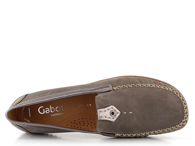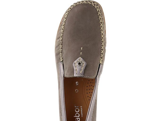 Luxusní dámské mokasíny od značky Gabor představují ideální volbu pro jarní a letní sezónu. Tento model vyniká prostorným a skvěle padnoucím střihem, který zaručuje maximální komfort. Svrchní materiál je vyroben z nubukové kůže doplněné o hladkou kůži, což dodává botám elegantní vzhled. Mokasíny se pyšní kouřovým hnědým odstínem v kombinaci s metalickou bronzovou barvou a módně prošívaným lemem špičky.