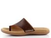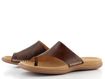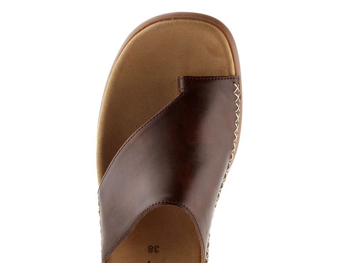 Dámské letní žabky z hladké kůže v hnědé barvě s plochým páskem mezi prsty a na pohodlné latexové podešvi.