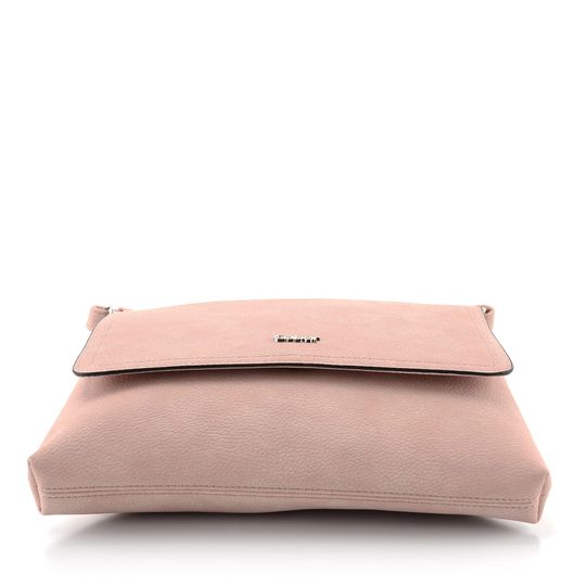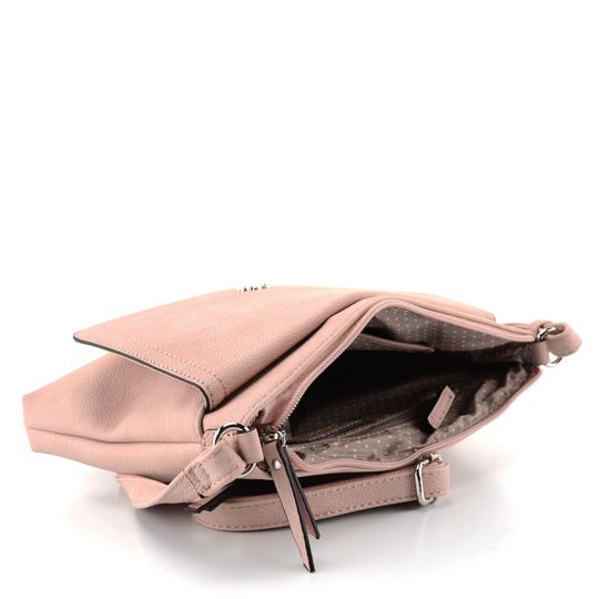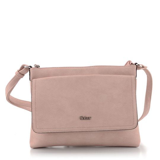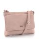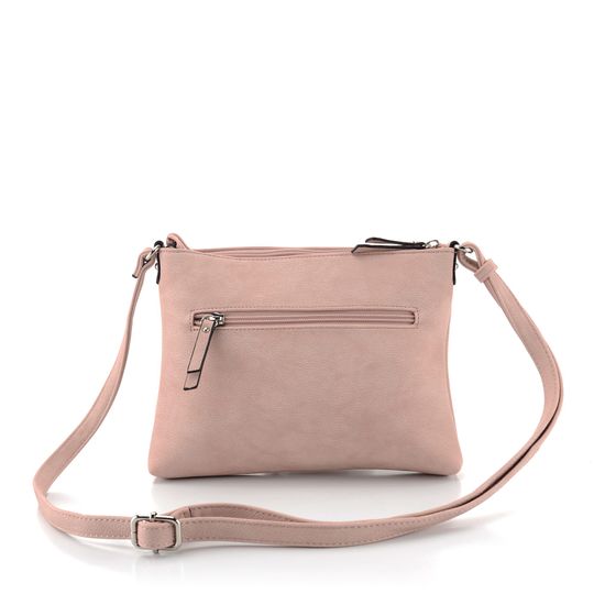 Menší crossbody kabelka v pudrově růžovém odstínu s pohotovostní kapsou a nastavitelným popruhem.