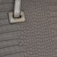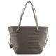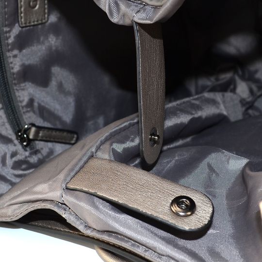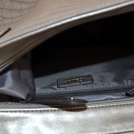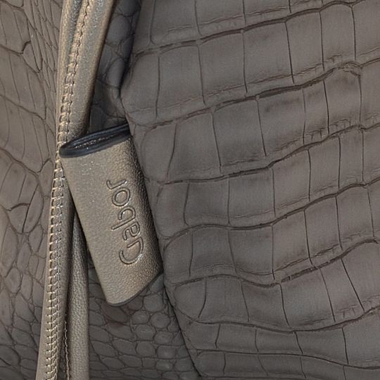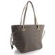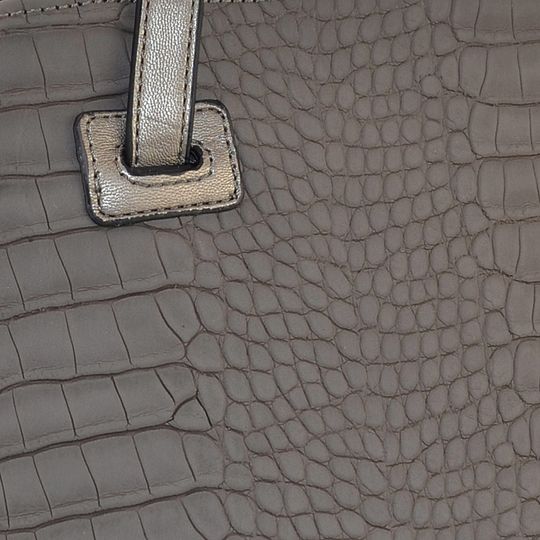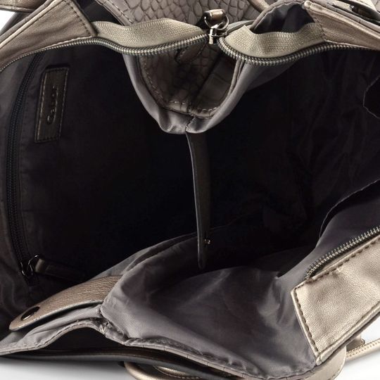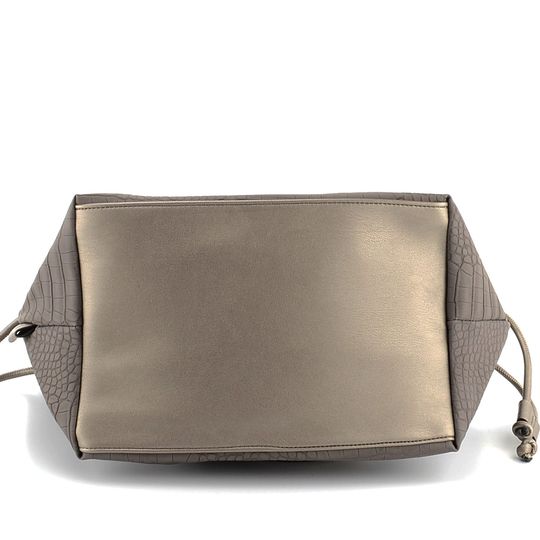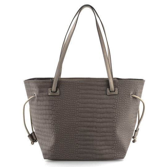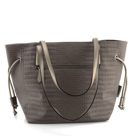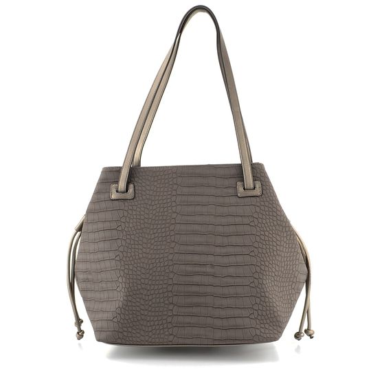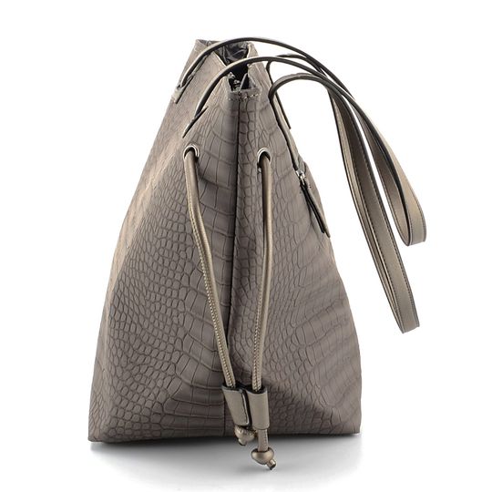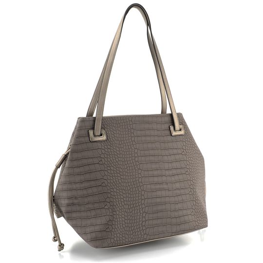 Dámská kabelka z hadinkové syntetiky ve šedohnědém provedení s dotahovanými bočnicemi.