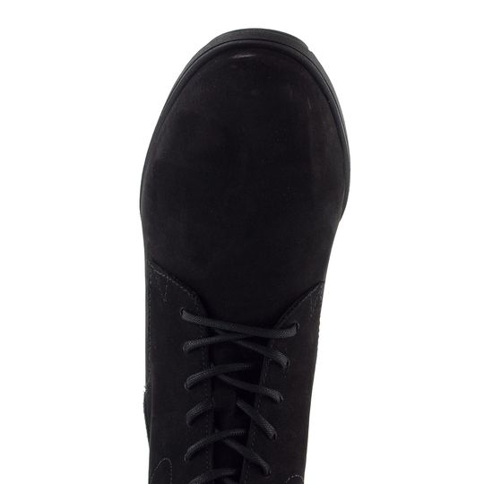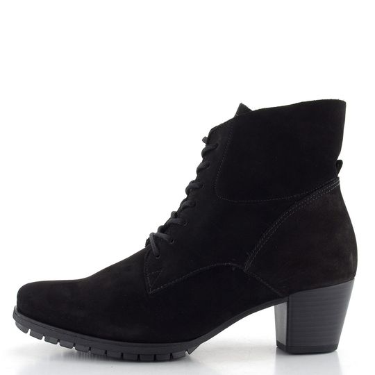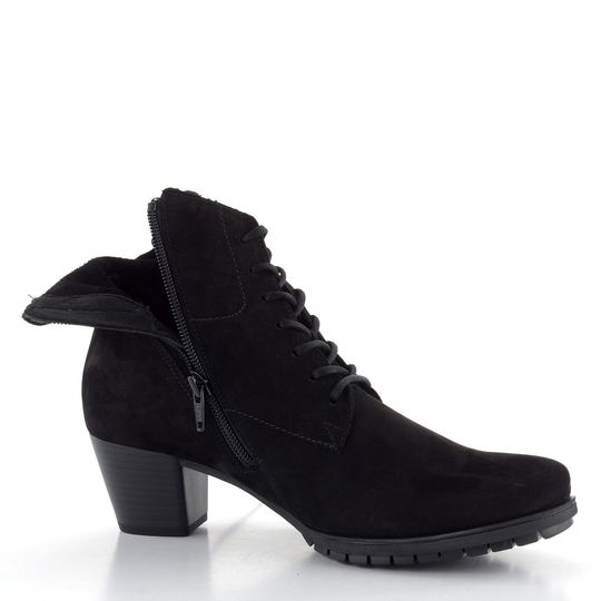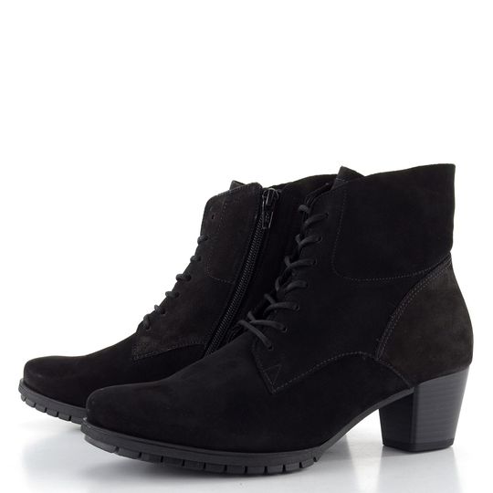 Elegantní dámské kotníkové boty od značky Gabor jsou ideální volbou pro podzimní a zimní sezónu. Tyto boty jsou navrženy v širším střihovém provedení a vyrobeny z kvalitní nubukové kůže v černé barvě. Díky šíři H jsou ideální pro širší typ chodidla. Vnitřní podšívka je z jemné textilie, která zajišťuje komfort při nošení, přestože obuv není vyteplená. Komfort dále zvyšuje měkká stélka a extra vyměkčený jazyk. Boty mají klasické šněrování a praktický postranní zip, který usnadňuje obutí. Flexibilní podešev s hrubším vzorkem a stabilní podpatek vysoký 5,2 cm zajišťují pohodlí a stabilitu. Tento model je součástí linie Gabor Comfort, která klade důraz na pohodlí a kvalitu.