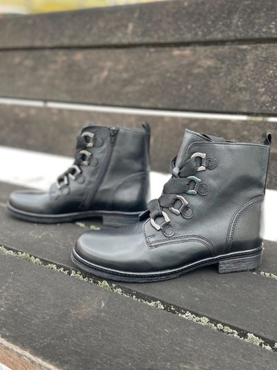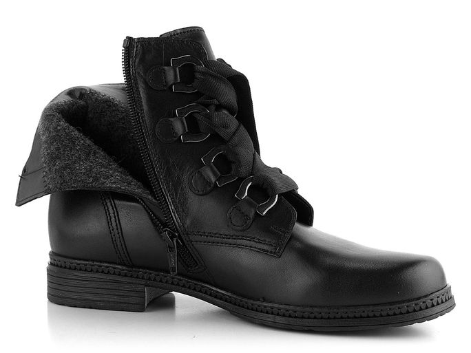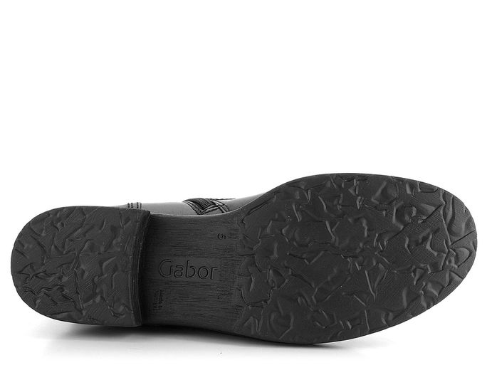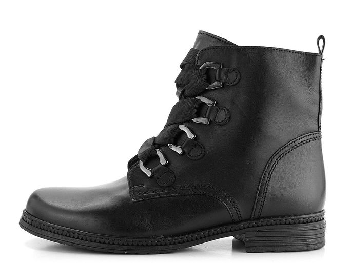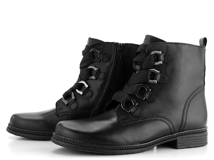 Dámská kotníčková obuv od značky Gabor v elegantní černé barvě je ideální volbou pro podzimní a zimní sezónu. Tyto boty z hladké kůže vynikají výraznými kovovými poutky ve starostříbrné barvě a módními širokými tkanicemi, které dodávají obuvi jedinečný vzhled. Díky postrannímu zipu je obutí snadné a komfortní. Uvnitř boty naleznete teplejší filcovou podšívku a vyjímatelnou filcovou stélku, což zajišťuje maximální pohodlí. Kvalitní latexová podešev se širokým nízkým podpatkem (3 cm) poskytuje stabilitu a komfort při chůzi. Výška kotníku je 14 cm (bez podpatku). Tato obuv je ideální volbou pro ženy, které hledají stylové a pohodlné boty do města i na lehkou procházku.