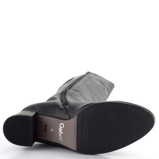Kozačky značky Gabor představují dokonalou kombinaci elegance a komfortu, ideální pro podzimní a zimní sezónu. Vyrobeny z hladké černé kůže, tyto vyšší uzavřené boty zaujmou svou jednoduchou čistou linií a kvalitním zpracováním. Díky úzké kulaté špičce a velikosti S jsou perfektní pro užší typ lýtka. Postranní zip v celé délce a pružná vsadka v horním obvodu zajišťují snadné obouvání a pohodlí. Vnitřní podšívka z mikrotextilie poskytuje vynikající tepelně-izolační vlastnosti, zatímco měkká stélka potažená textilií přispívá k celkovému komfortu. Syntetická podešev s jemným vzorkem a širokým potaženým podpatkem o výšce 4,5 cm dodává stabilitu a styl. Výška kozaček je 39 cm (bez podpatku) a horní vnější obvod činí 36 cm (pro vel. 38). Tento model je ideální volbou pro ženy, které hledají kvalitní a stylovou obuv pro každodenní nošení i formální příležitosti.