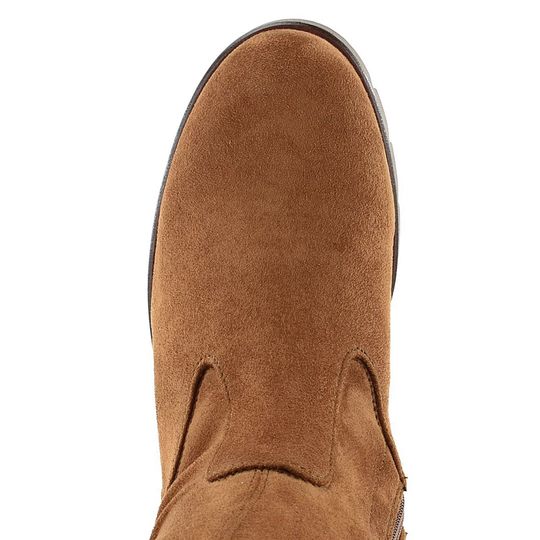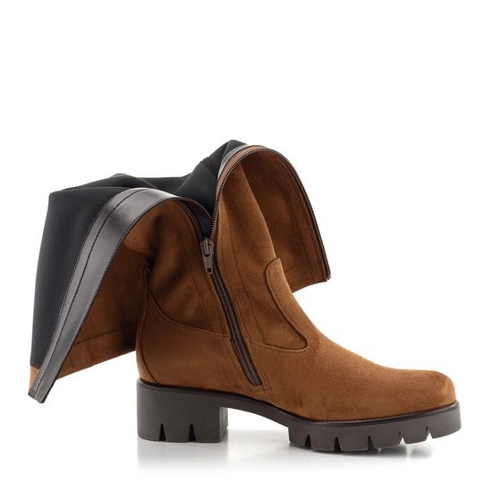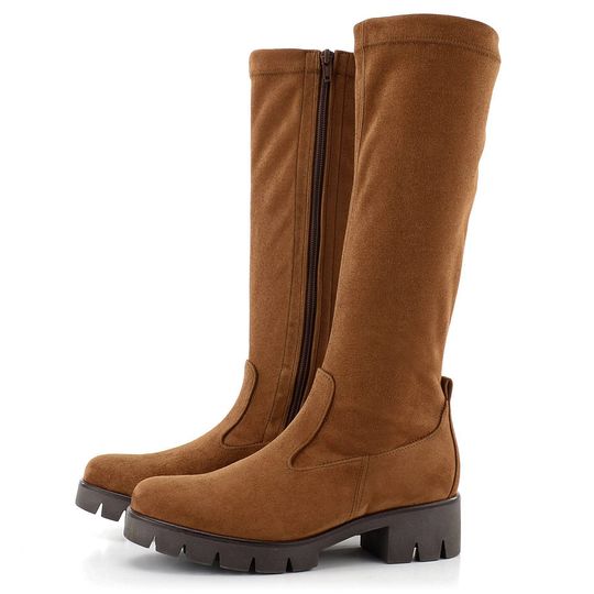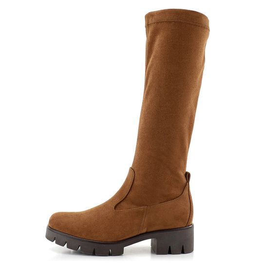 Dámské kozačky z pružného materiálu se semišovým povrchem ve středně hnědé barvě a ve velikosti M - stretch.